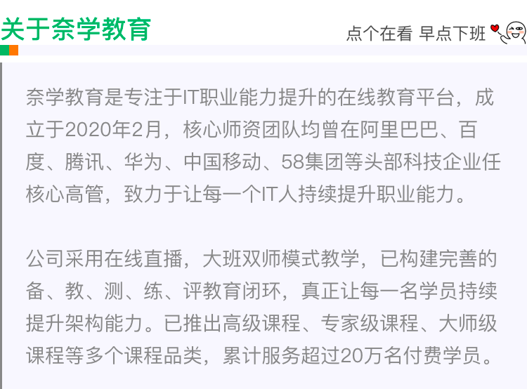 通过学习,你将精通包括MySQL架构设计深入剖析篇、千亿级企业海量数据分库分表方法论提炼篇、千亿级企业海量数据真实案例设计与实践等核心实战内容,通过通俗易懂的企业案例式讲解,带你真正掌握架构师级MySQL海量数据设计与实践,从而在成为优秀架构师的路上越走越快!