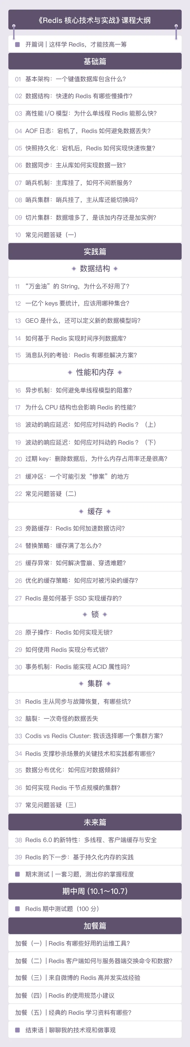 这样,才能透彻理解 Redis,建立起结构化的知识体系,快速找到引发问题的关键因素,甚至整理成 Checklist,作为遇到问题时信手拈来的“锦囊妙计”。这也是蒋老师在开篇词里提到的,设计这个专栏的出发点。类似的干货有很多,具体可以看看目录: