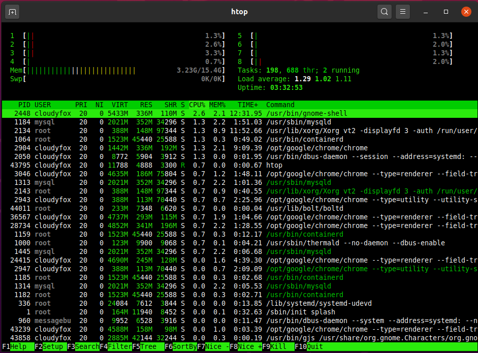htop是一个交互式系统监视、进程查看和进程管理器。它被设计为Unix下的任务管理器top的替代品,它显示了在计算机上运行的进程列表,通常按CPU使用量排序,她还可以垂直和水平滚动列表以查看所有进程和完整的命令行。