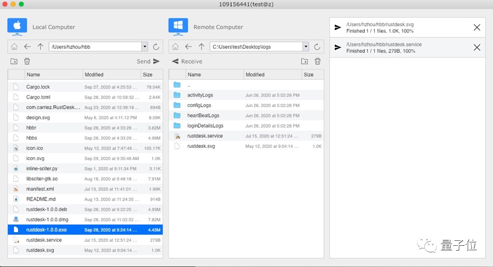 它支持跨平台传输文件。比如,Mac 和 Windows 电脑之间进行文件传输时,界面长这样: