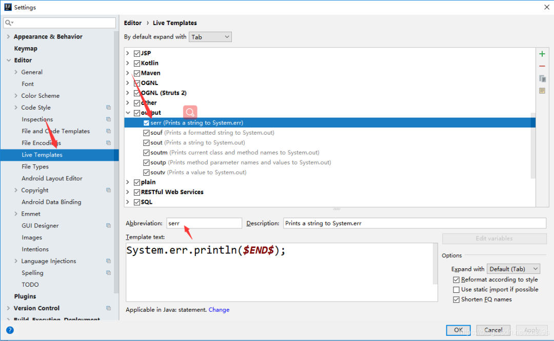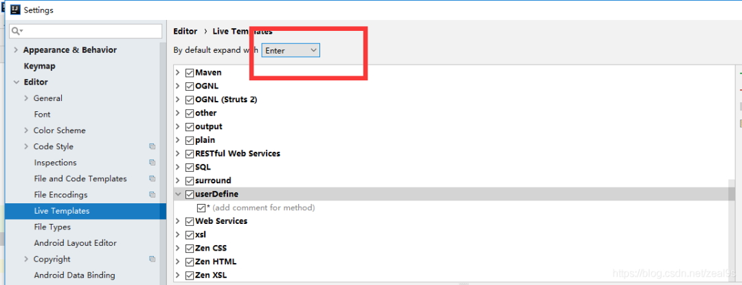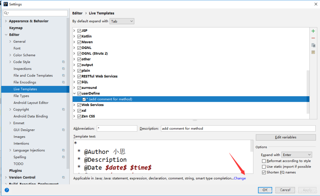 1、File–>Settings–>Editor–>Live Templates