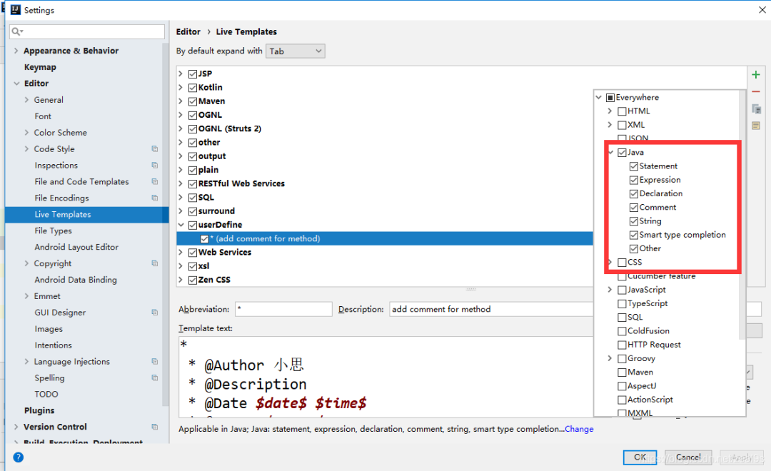 点击模板页面最下方的警告,来设置将模板应用于那些场景,一般选择EveryWhere–>Java即可(如果曾经修改过,则显示为change而不是define)