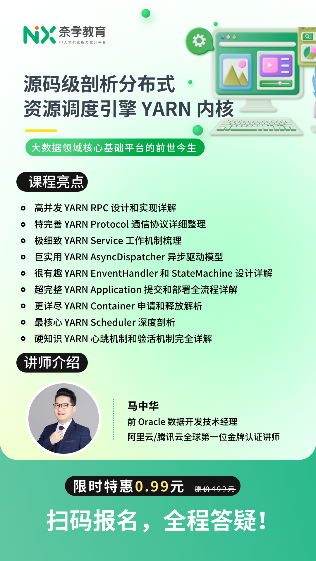 主讲马中华老师,是阿里云/腾讯云认证的全球首位金牌讲师,在 Oracle 有多年的大数据开发经验。跟着他学习 YARN 的源码架构与内核,有问题就在直播间和群里随时提问,几乎没有什么好顾虑的。况且,前转转公司大数据资深架构师、Hadoop平台负责人李希沅老师也会加入授课,解答你所以大数据的核心问题。