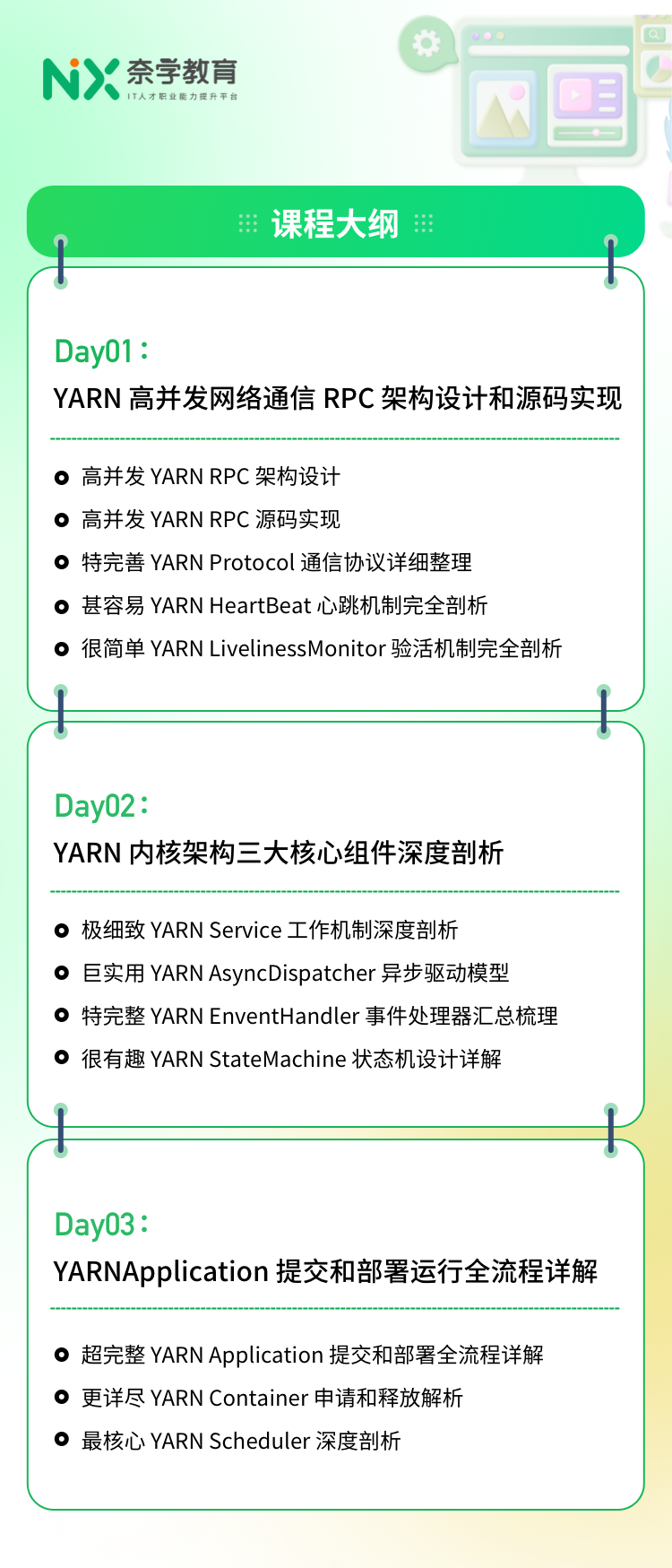 最后一天课程将以万亿级企业大数据平台为引,全流程带你深入掌握 YARN Application 等核心部分的应用与实战。