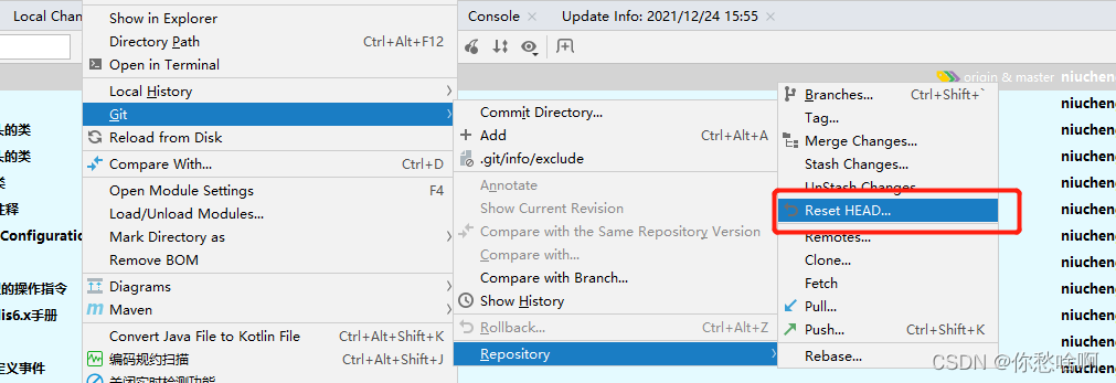 2、然后调出“Reset Head”窗口,项目名上->右击->git->Repository->Reset HEAD...,