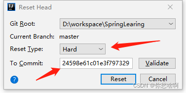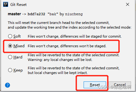 点击Rest后,之前提交的代码会丢失,需要做好本地备份,做完该操作以后远程仓库的提交记录还存在,需用git 指令强制提交到远程仓库。