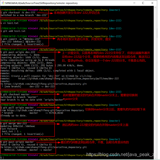 git push origin dev-222 (将新建的分支修改推送到远端服务器,推送完以后,自己登陆github,你会发现多一个dev-222的分支,当然不推就没有,这个github需要自己注册一下)