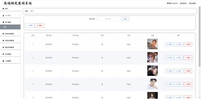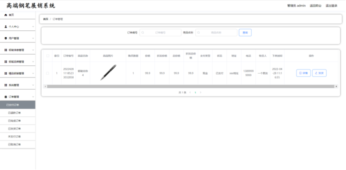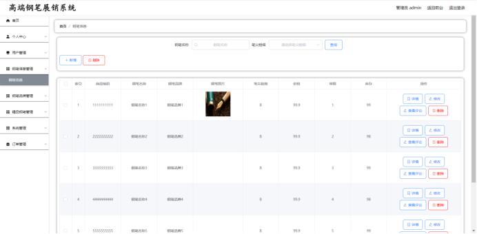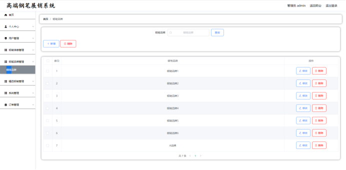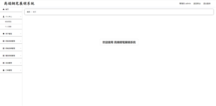管理员:首页,个人中心,用户管理,钢笔信息管理,钢笔品牌管理,精品钢笔管理,系统管理,订单管理等功能。
