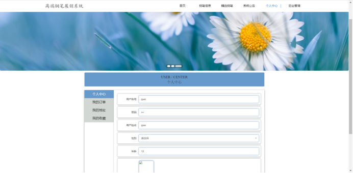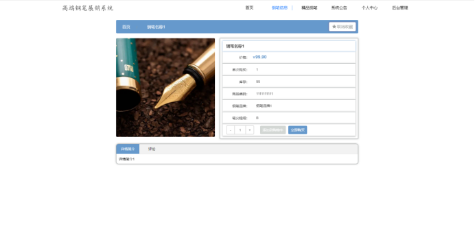 前台:首页,钢笔信息,精品钢笔,系统公告,个人中心,购物车等功能