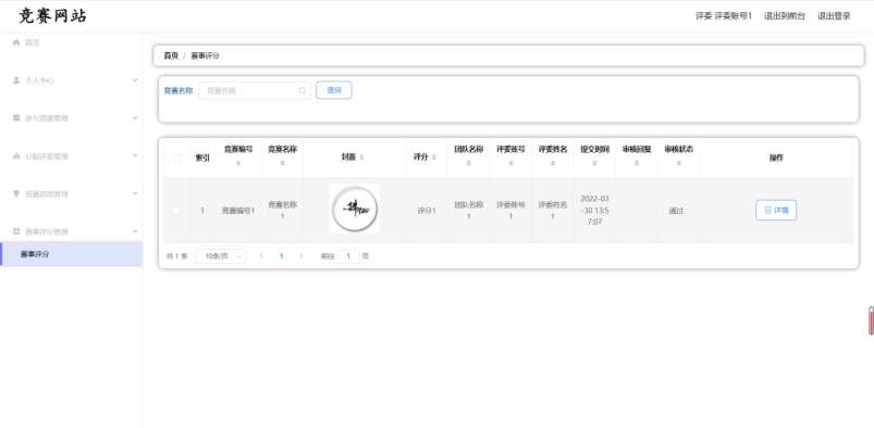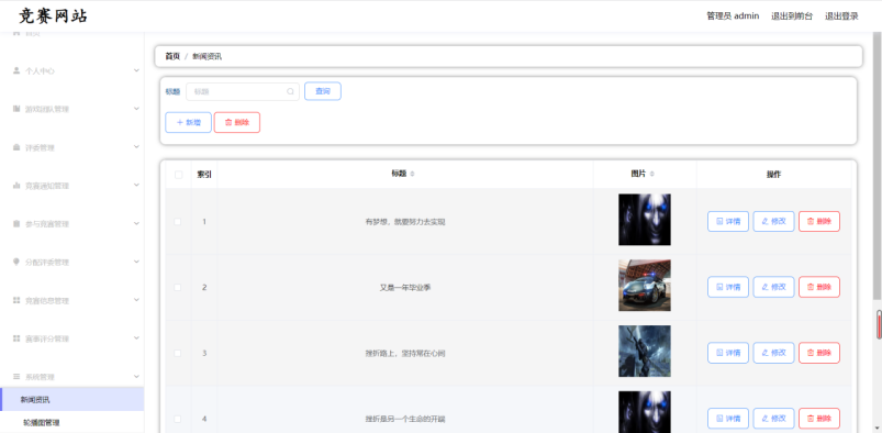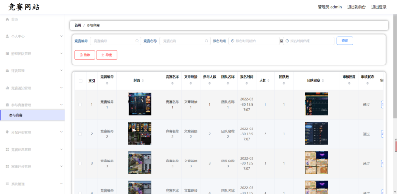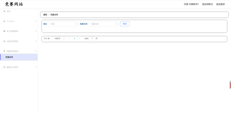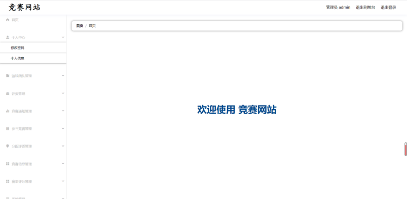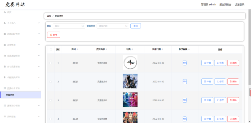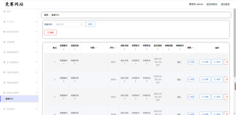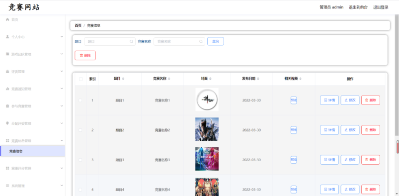 管理员:个人中心、游戏团队管理、评委管理、竞赛通知管理、参与竞赛管理、分配评委管理、竞赛信息管理、赛事评分管理、 系统管理等功能。