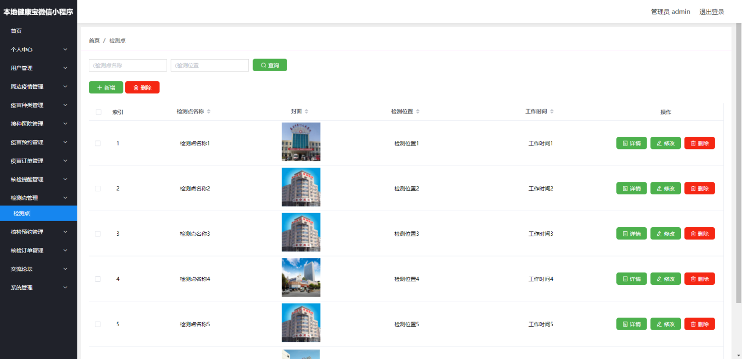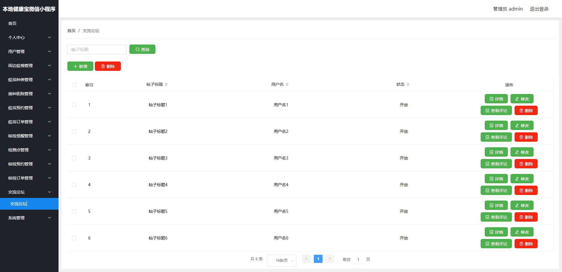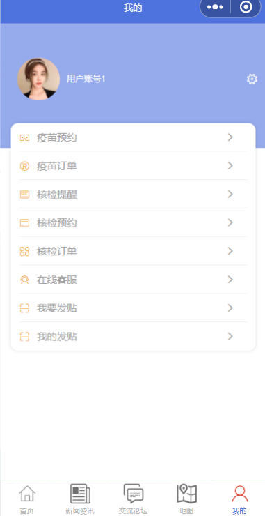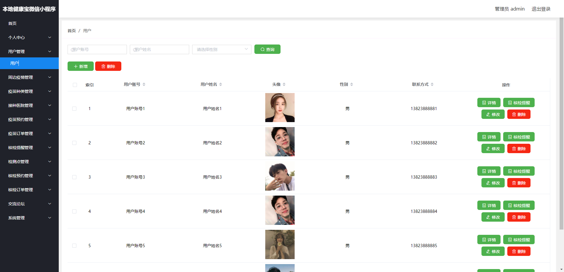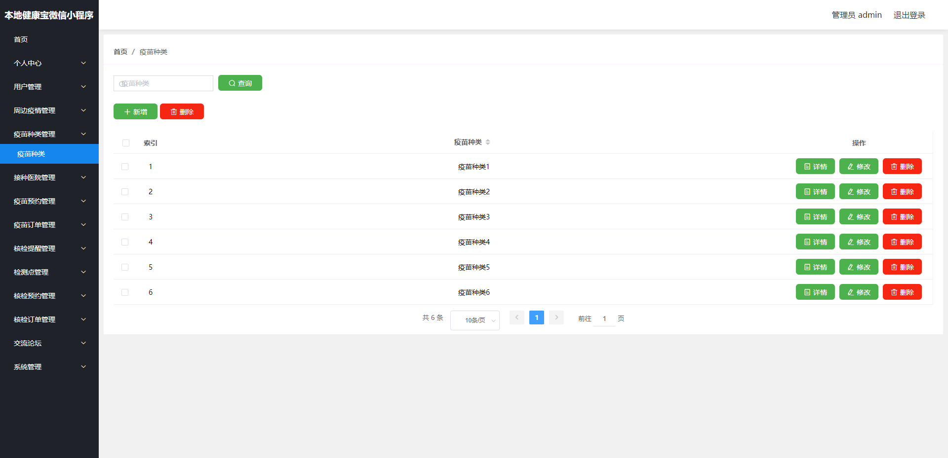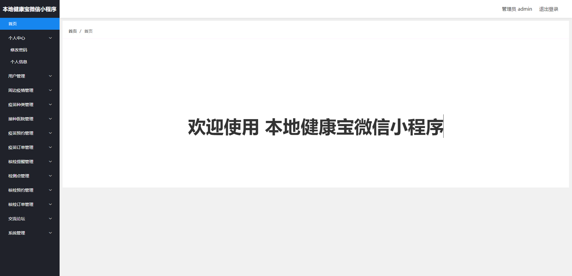 管理员:个人中心、用户管理、周边疫情管理、疫苗种类管理、接种预约管理、疫苗预约管理、疫苗订单管理、 核检提醒管理、核酸检测点管理、核检预约管理、核检订单管理、交流论坛、系统管理等