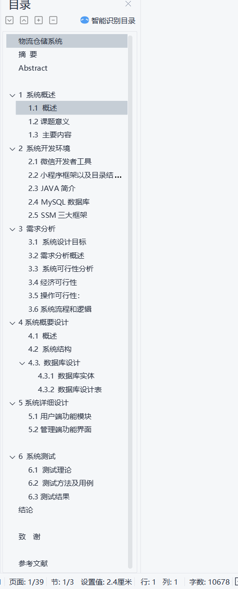 随着社会的发展,社会的方方面面都在利用信息化时代的优势。互联网的优势和普及使得各种系统的开发成为必需。 本文以实际运用为开发背景,运用软件工程原理和开发方法,它主要是采用java语言技术和mysql数据库来完成对系统的设计。整个开发过程首先对物流仓储系统进行需求分析,得出物流仓储系统主要功能。接着对物流仓储系统进行总体设计和详细设计。总体设计主要包括小程序功能设计、小程序总体结构设计、小程序数据结构设计和小程序安全设计等;详细设计主要包括物流仓储系统数据库访问的实现,主要功能模块的具体实现,模块实现关键代码等。最后对物流仓储系统进行了功能测试,并对测试结果进行了分析总结,得出物流仓储系统存在的不足及需要改进的地方,为以后的物流仓储系统维护提供了方便,同时也为今后开发类似物流仓储系统提供了借鉴和帮助。 物流仓储系统开发使系统能够更加方便快捷,同时也促使物流仓储系统变的更加系统化、有序化。系统界面较友好,易于操作。