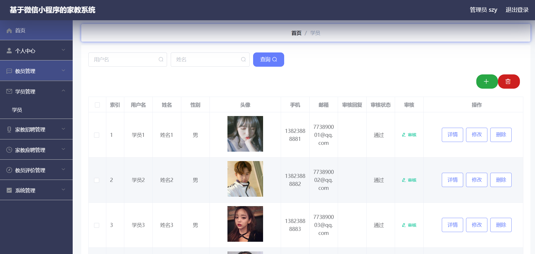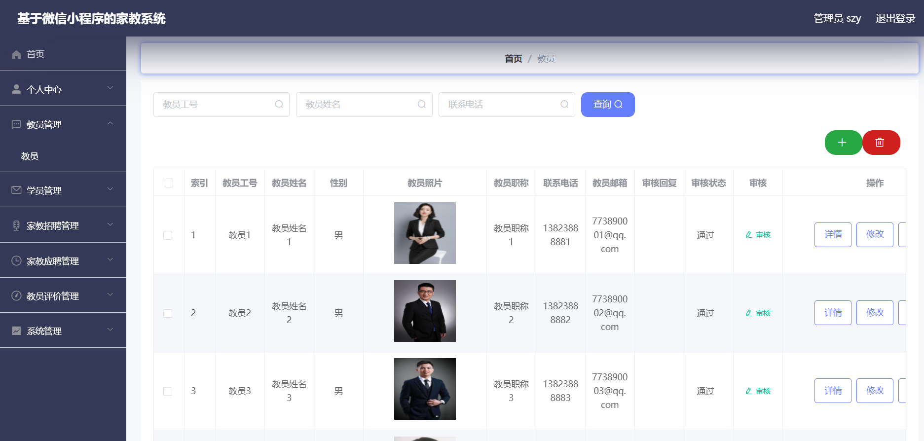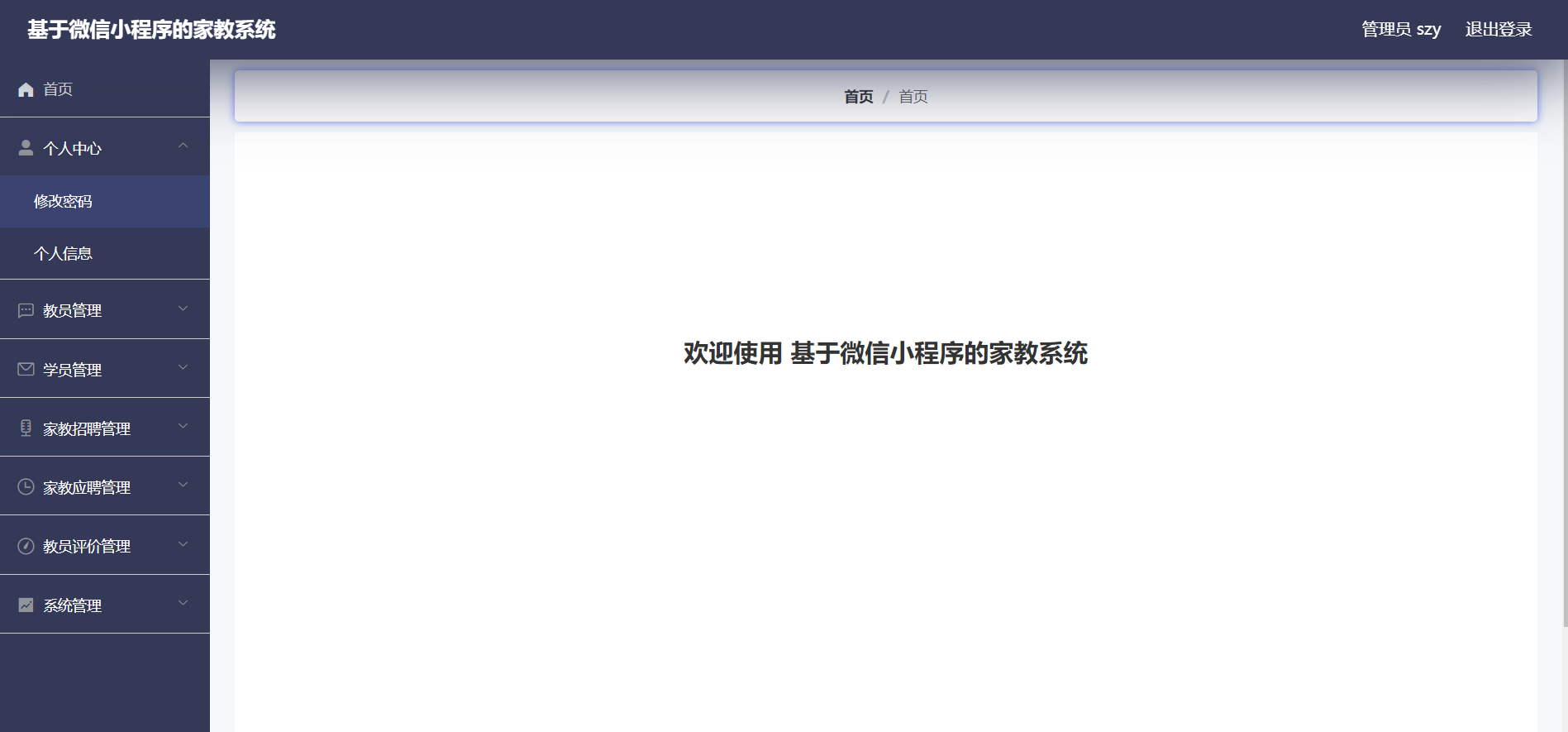 管理员:首页、个人中心、教员管理、学员管理、家教招聘管理、家教应聘管理、教员评价管理、系统管理等功能。