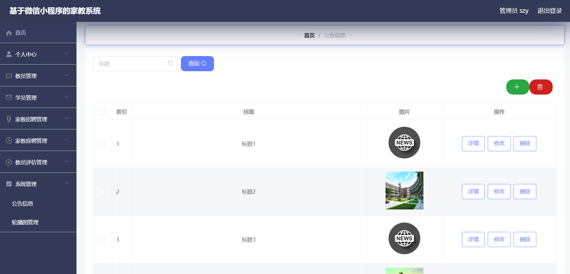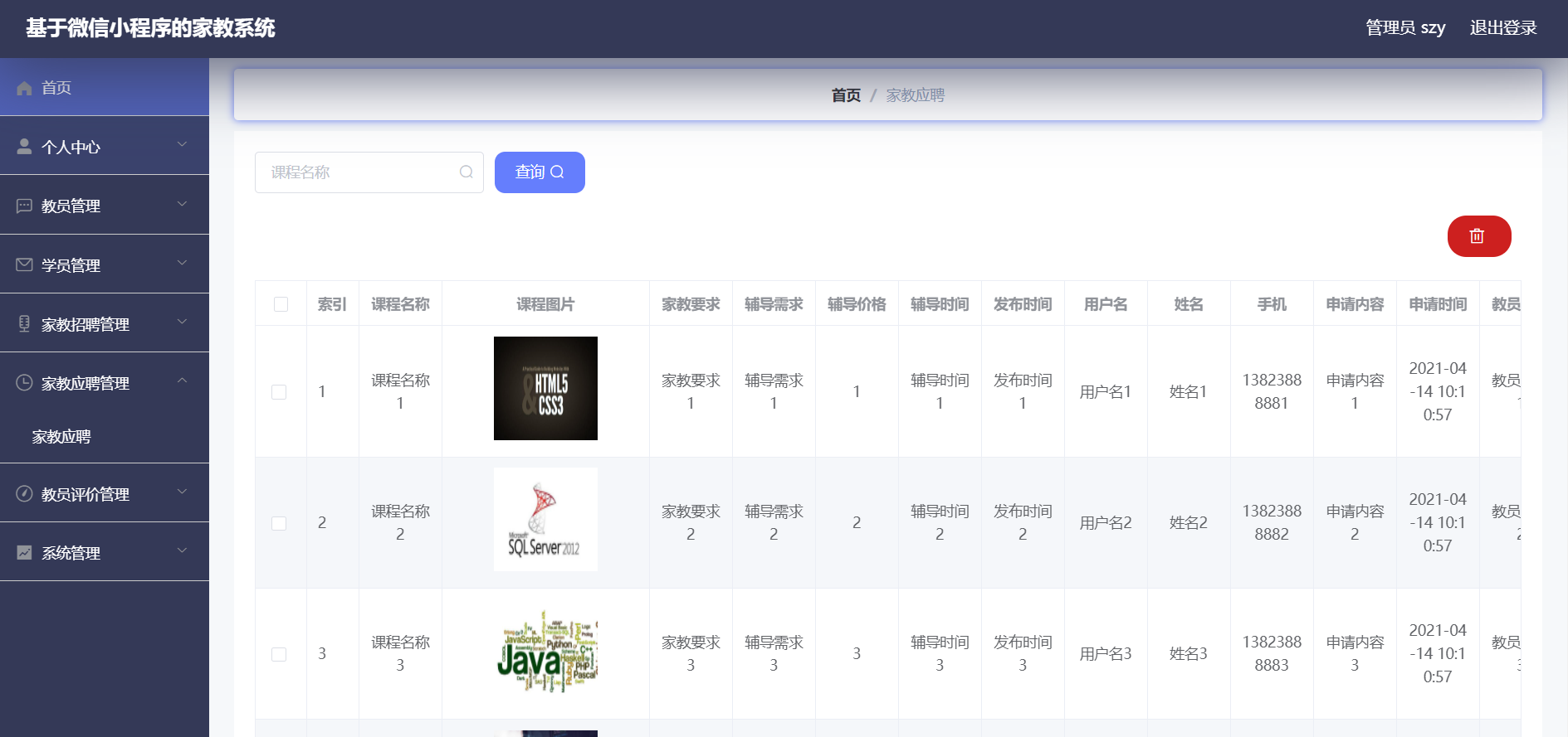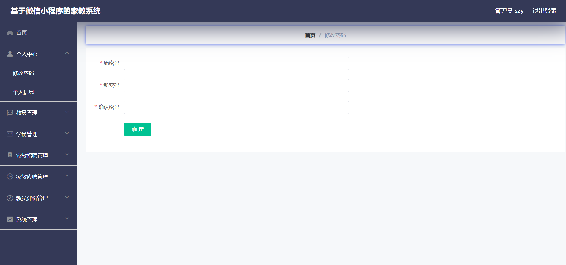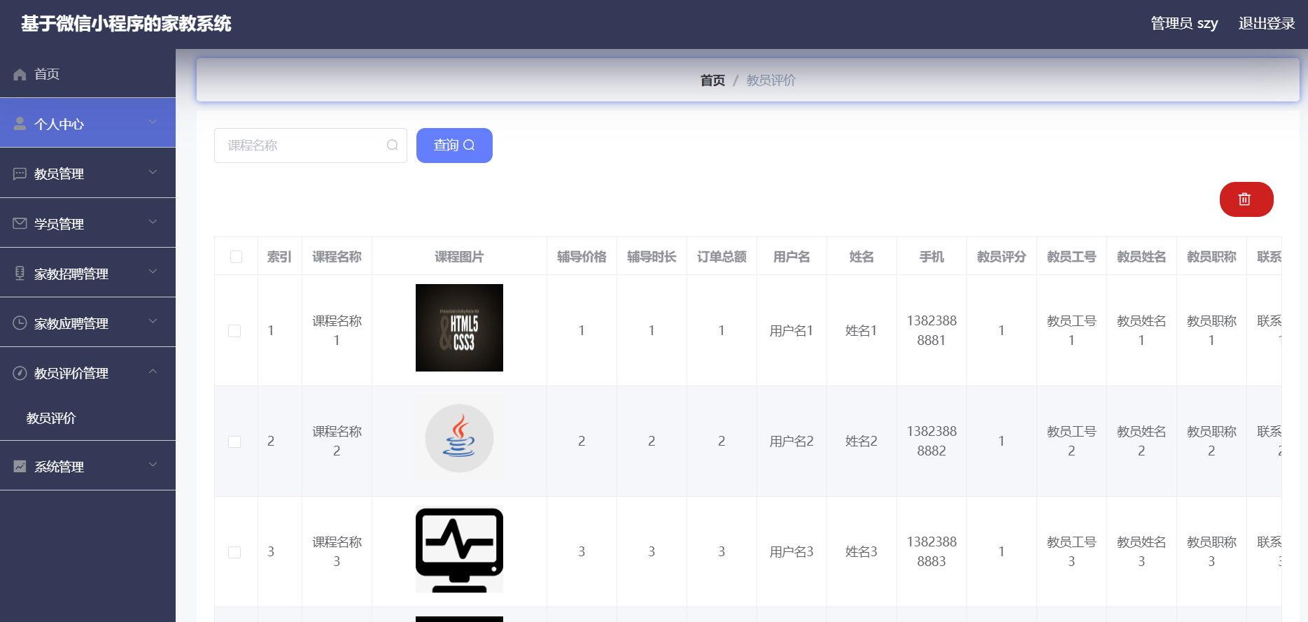 管理员:首页、个人中心、教员管理、学员管理、家教招聘管理、家教应聘管理、教员评价管理、系统管理等功能。