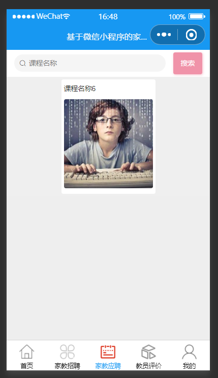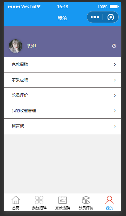 用户:首页、家教招聘、家教应聘、教员评价、我的等