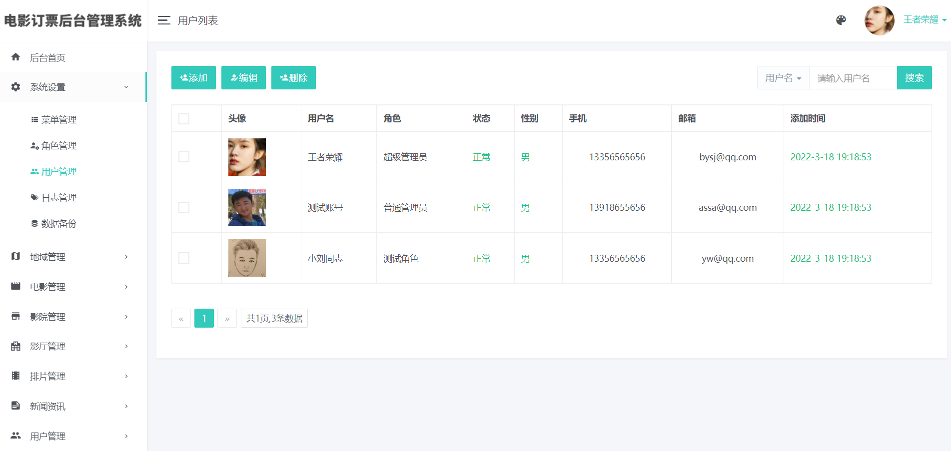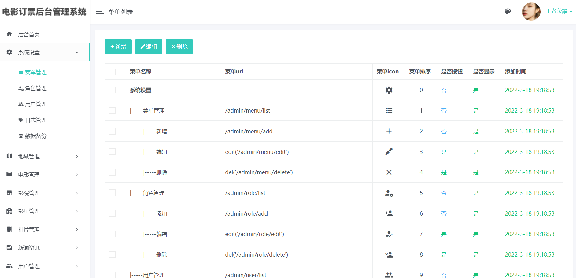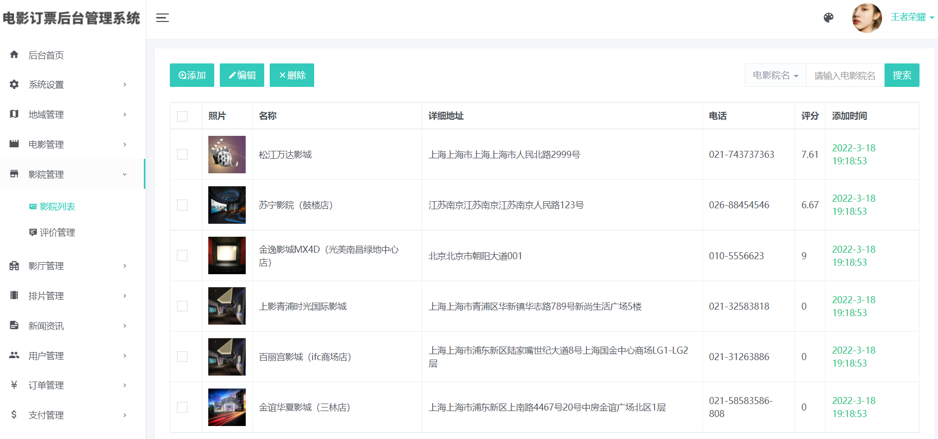 3)影院管理(添加、编辑、删除:支持上传图片)、影院评价管理