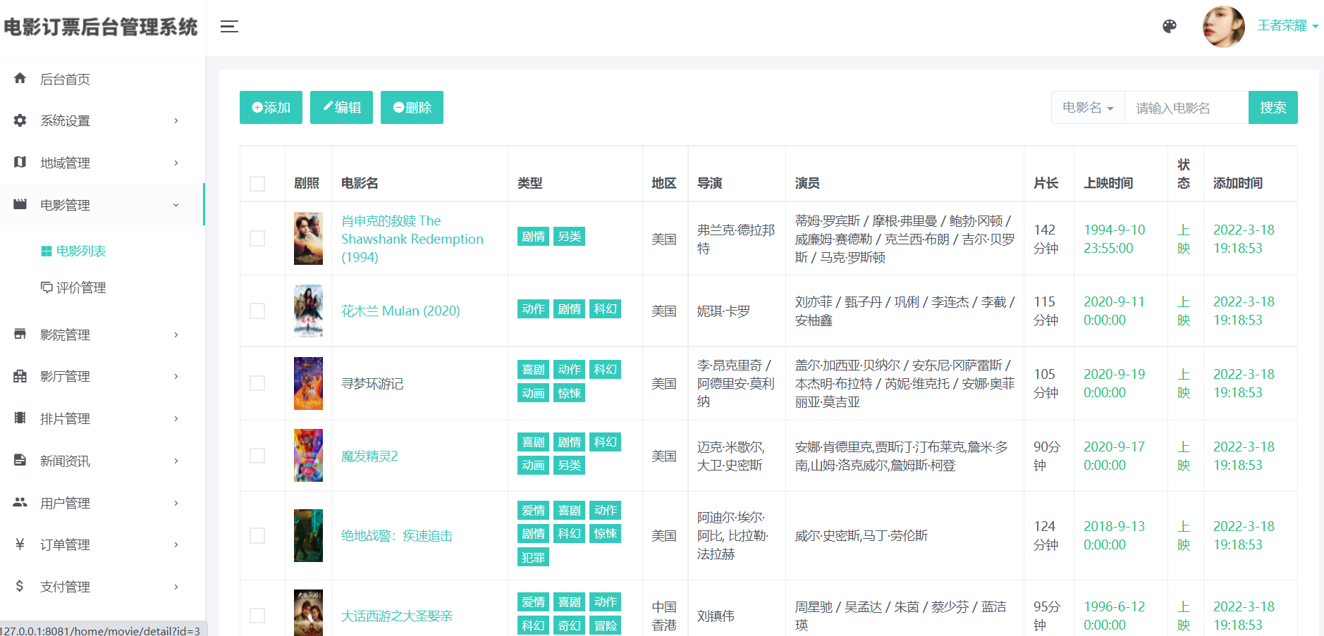 2)电影管理(添加、编辑、删除:支持上传多图及视频预告)、电影评价管理
