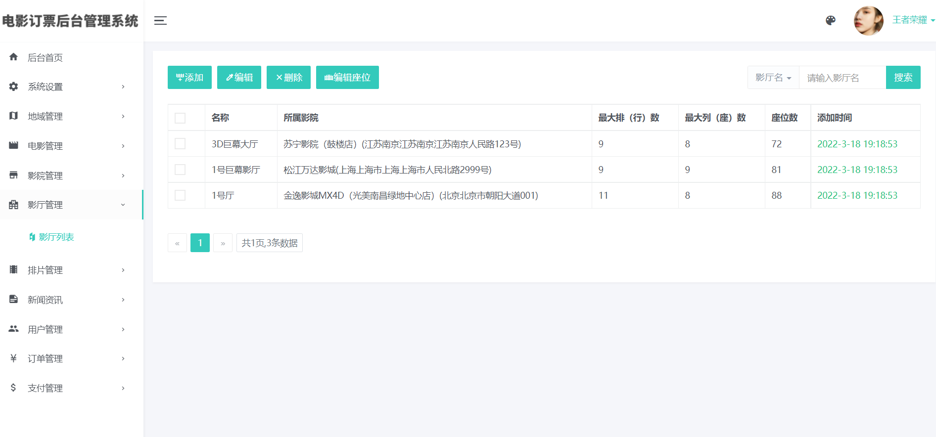 4)影厅管理(包括添加、编辑、删除及座位批量生成和管理)