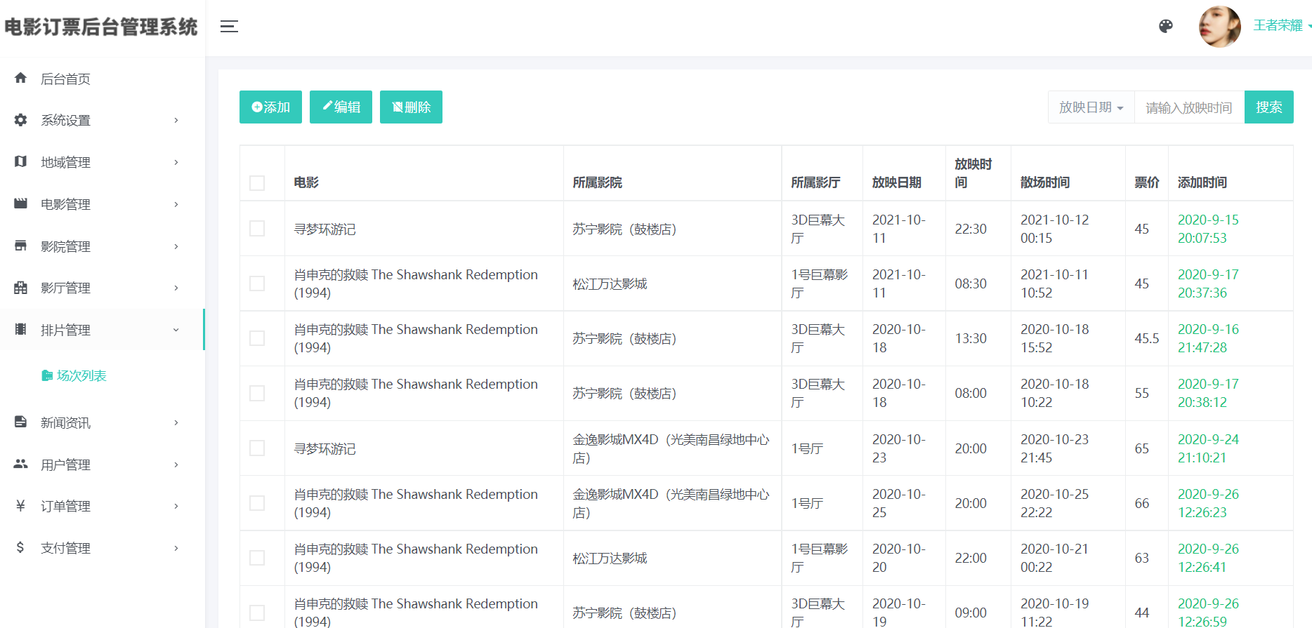 5)拍片场次管理(对每个电影进行排片、支持自动检测影厅时间冲突)