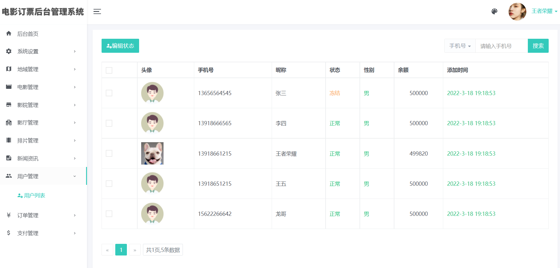 7)用户管理(可编辑用户状态,使之不能登录等)