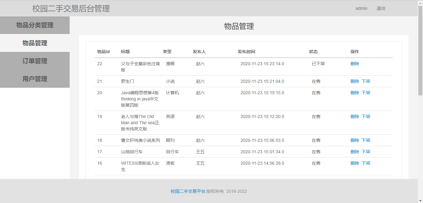 本系统为基于jsp+ssm+mysql的校园二手物品交易平台,包含学生和管理员角色,功能如下: