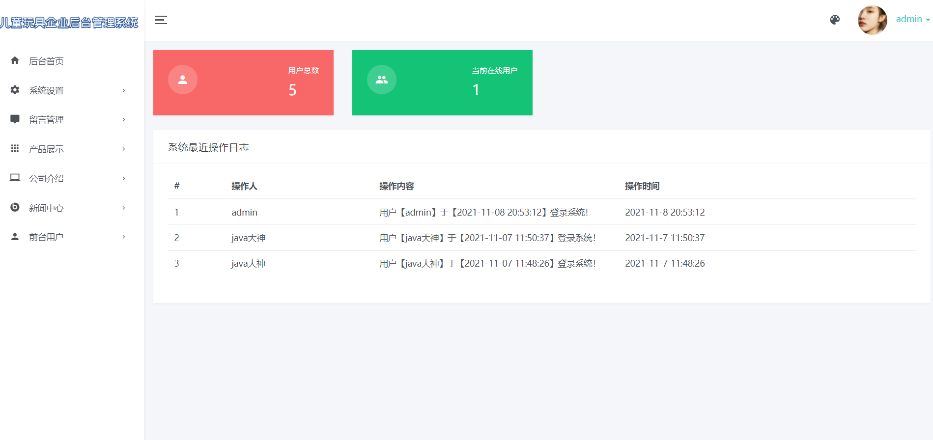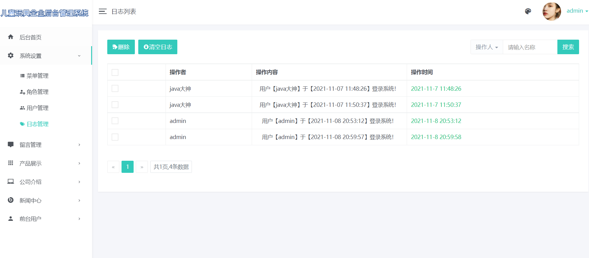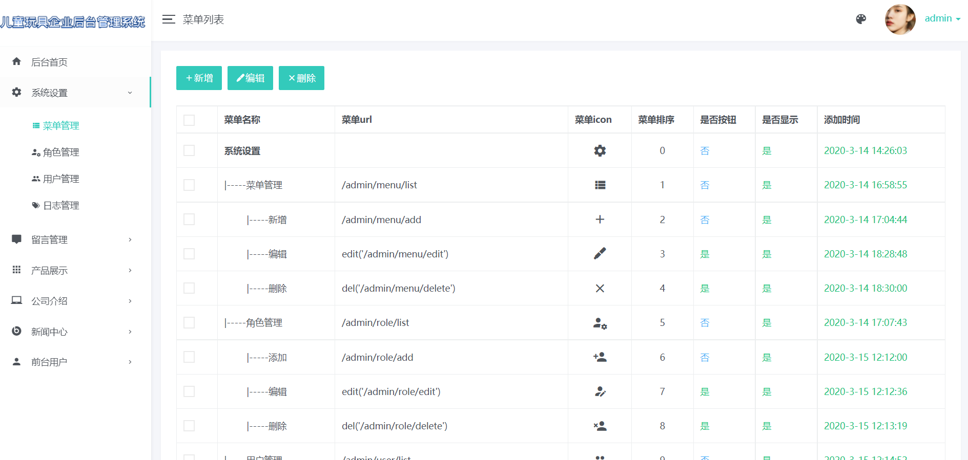 后台包含:菜单管理、角色管理、用户管理、日志管理、留言管理、产品展示管理、公司介绍管理、新闻信息管理、前台用户管理等