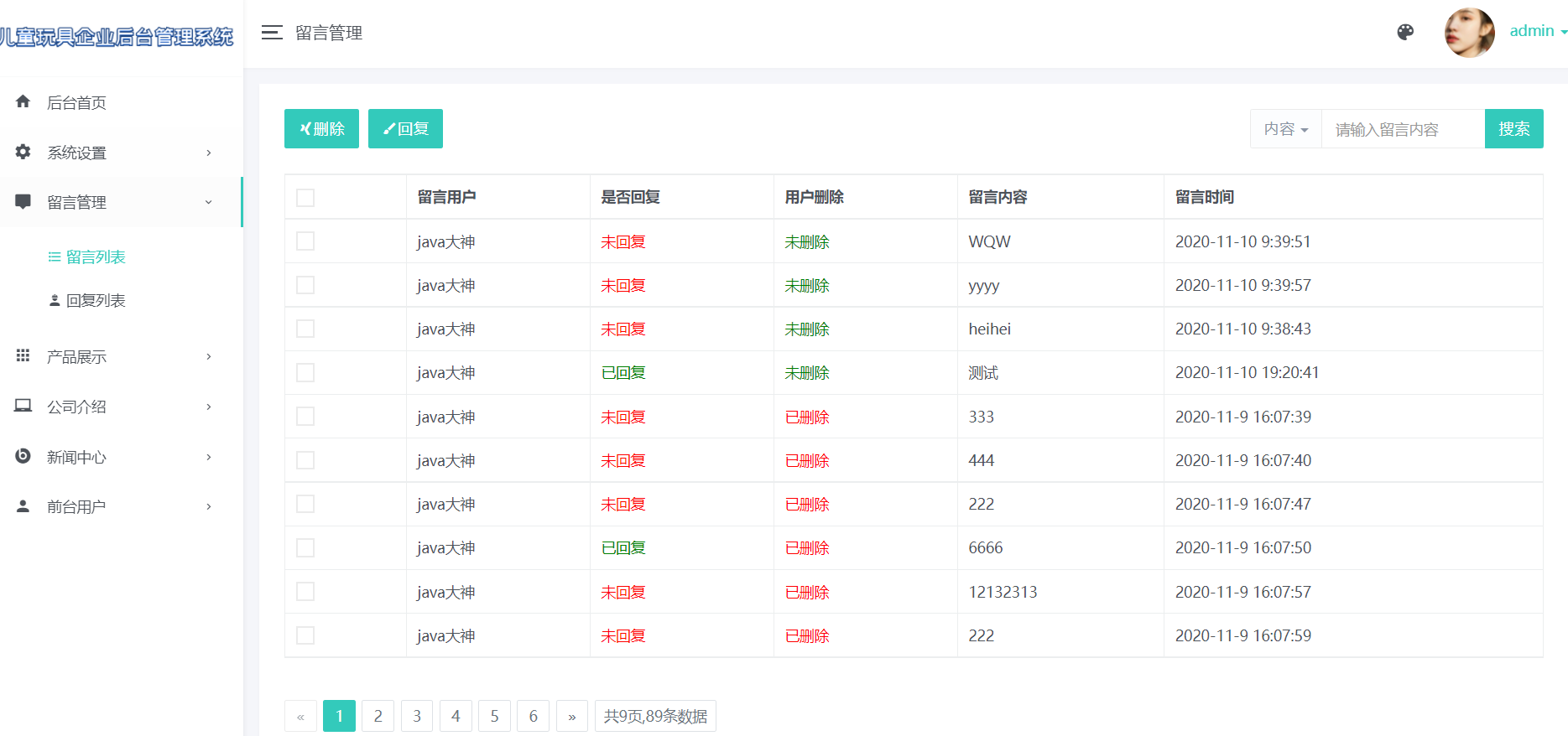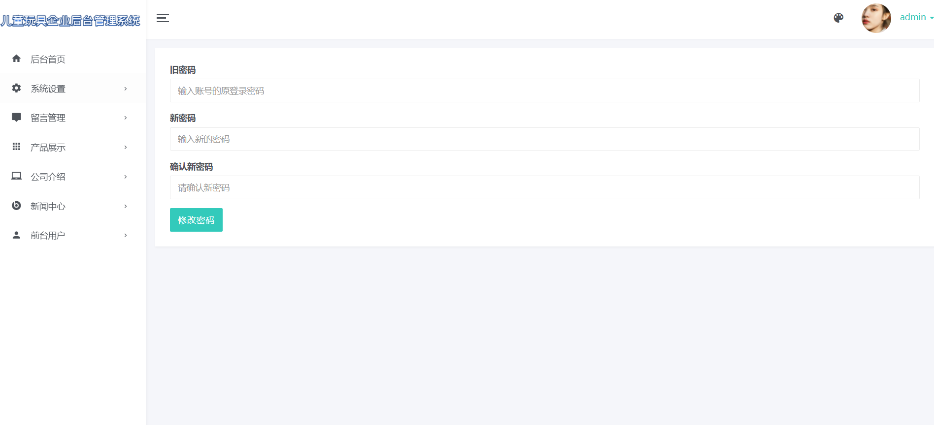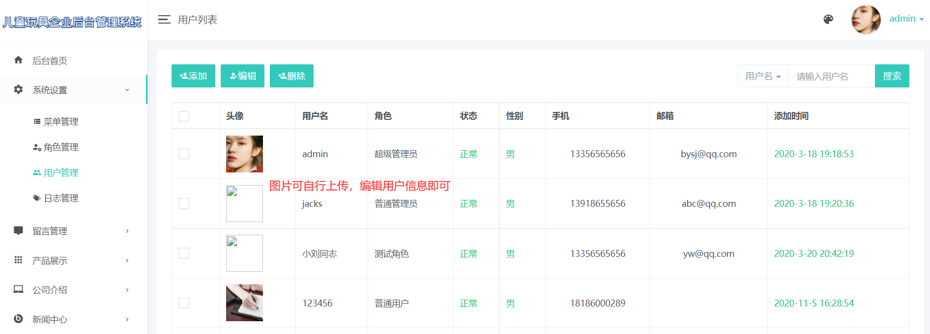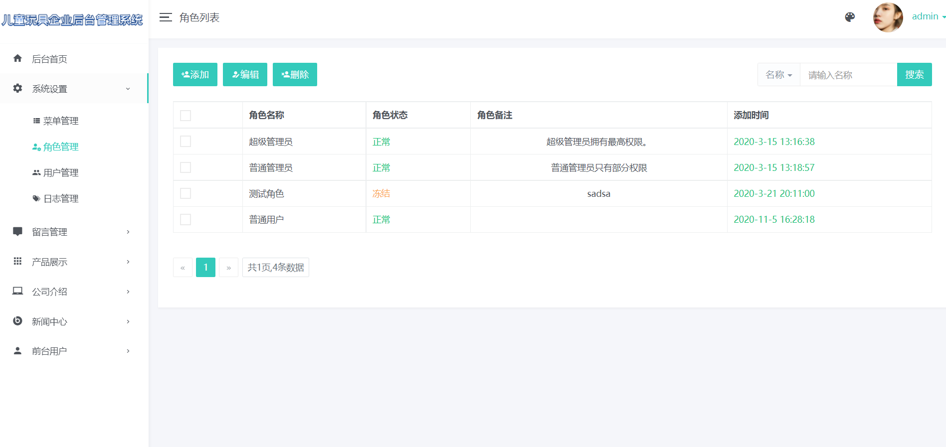 后台包含:菜单管理、角色管理、用户管理、日志管理、留言管理、产品展示管理、公司介绍管理、新闻信息管理、前台用户管理等