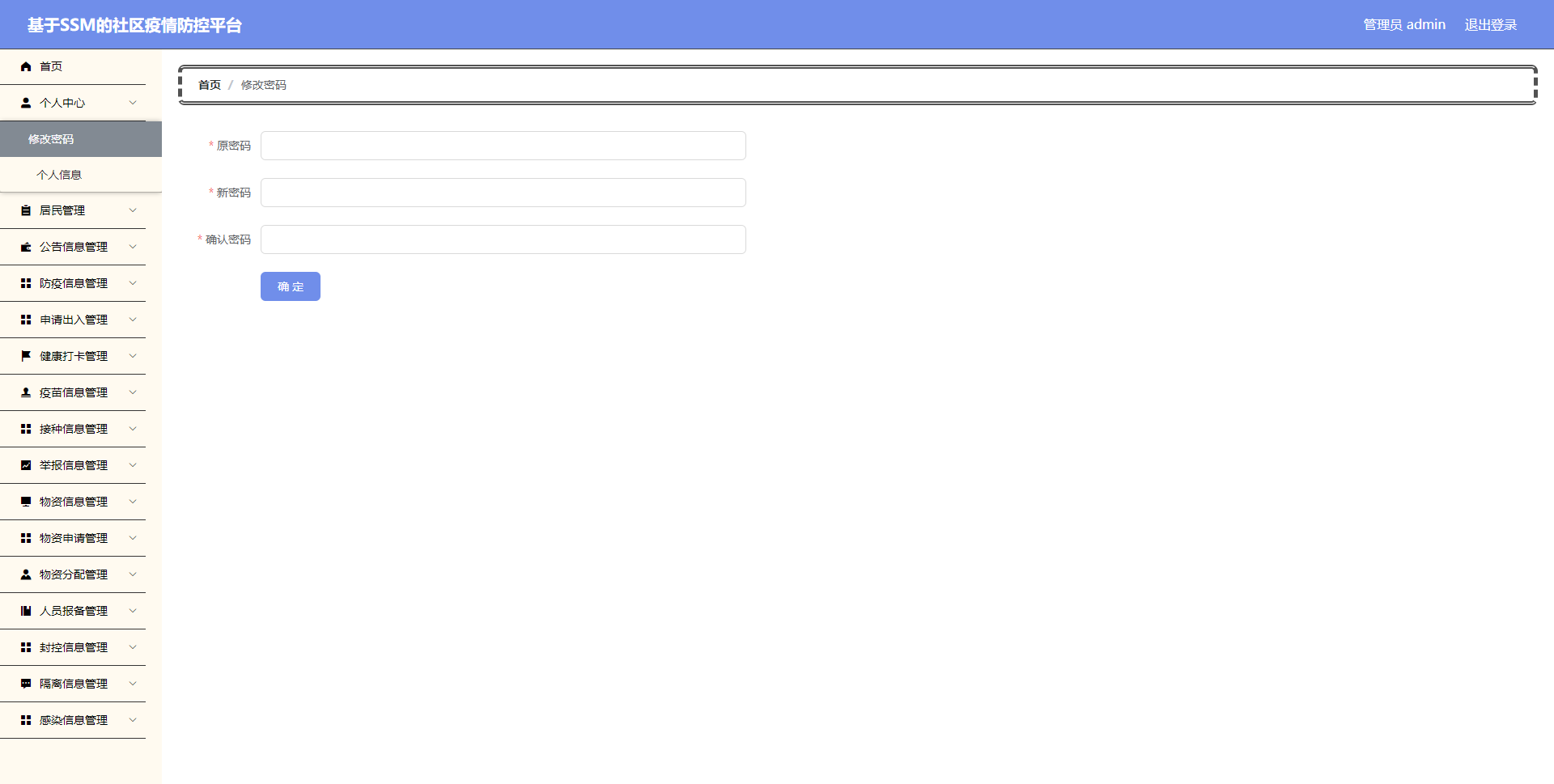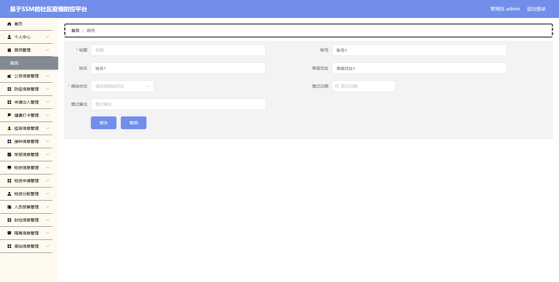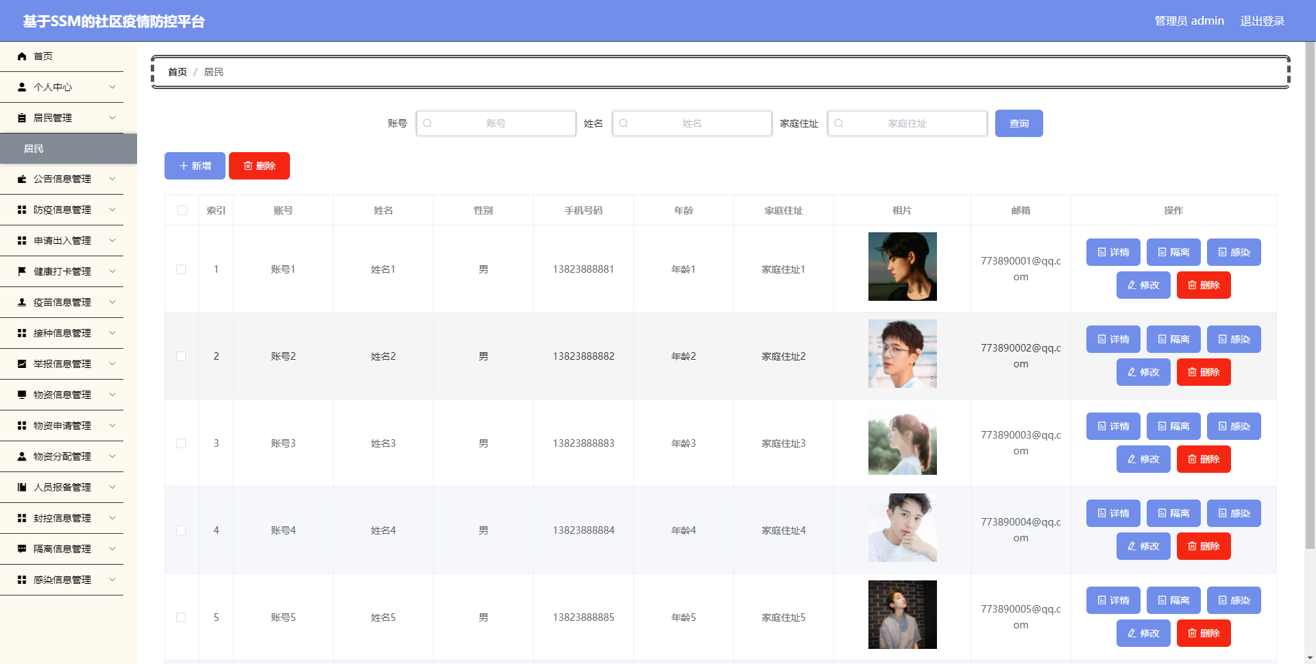 管理员:首页,个人中心,居民管理,公告信息管理,防疫信息管理,申请出入管理,健康打卡管理,接种信息管理,举报信息管理,物资信息管理, 物资申请管理,物资分配管理,人员报备管理,封控信息管理,隔离信息管理,感染信息管理等
