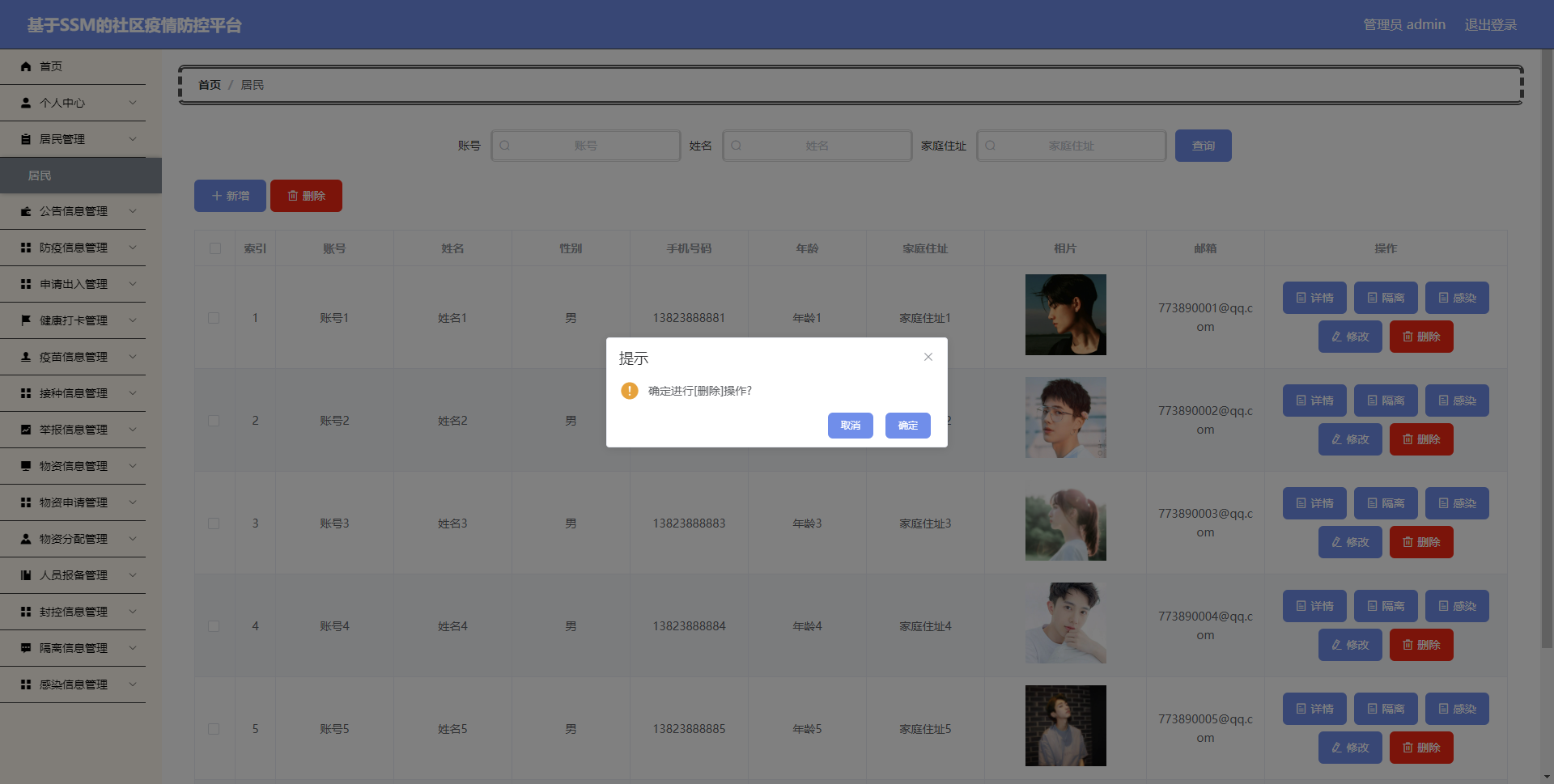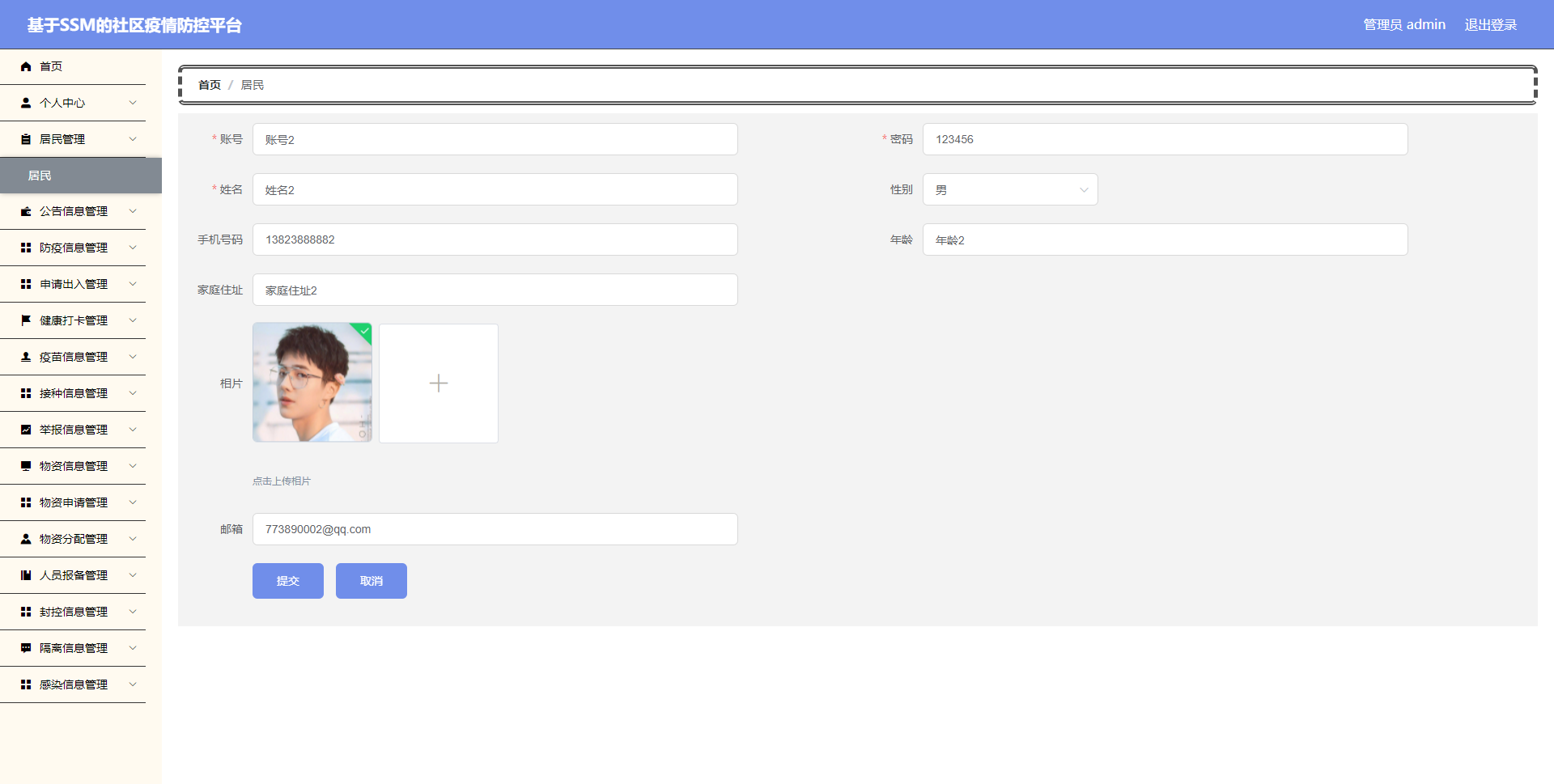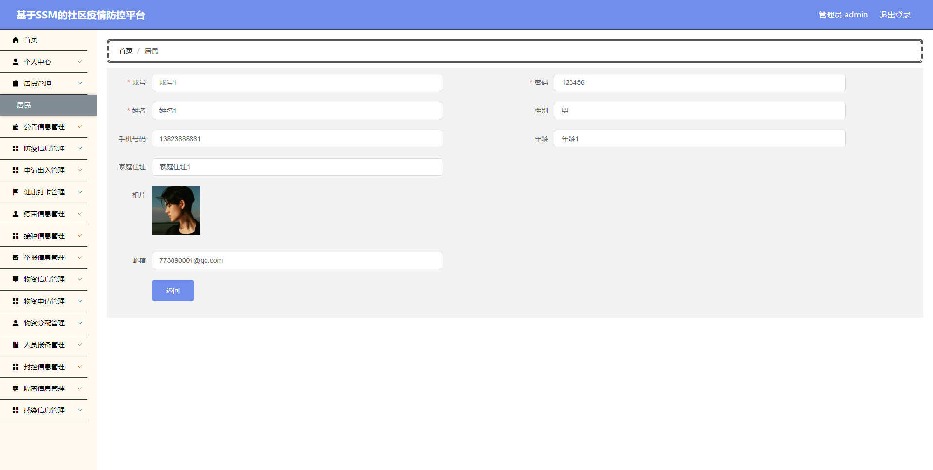 管理员:首页,个人中心,居民管理,公告信息管理,防疫信息管理,申请出入管理,健康打卡管理,接种信息管理,举报信息管理,物资信息管理, 物资申请管理,物资分配管理,人员报备管理,封控信息管理,隔离信息管理,感染信息管理等