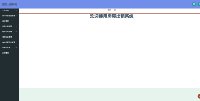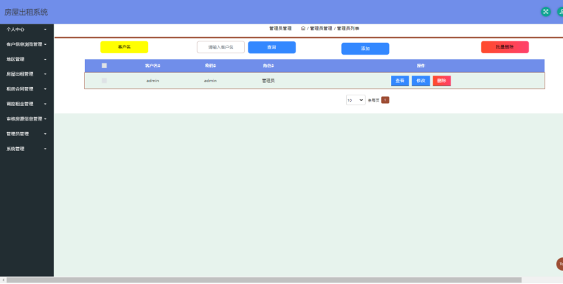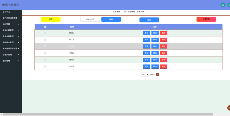 管理员:个人中心、用户管理、地区管理、房屋信息管理、租赁房屋管理、保障申请管理、看房预约管理、管理员管理、系统管理等