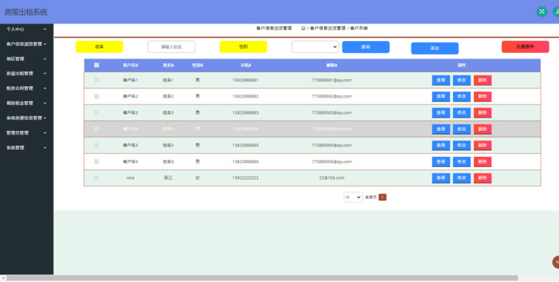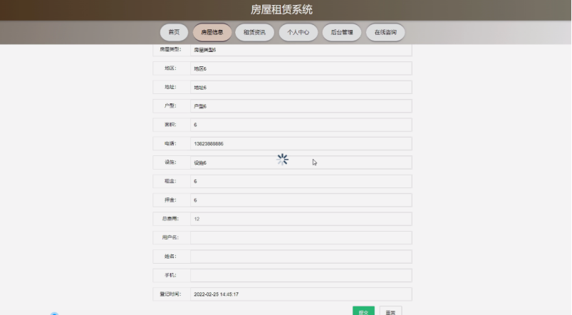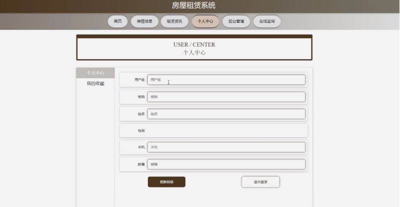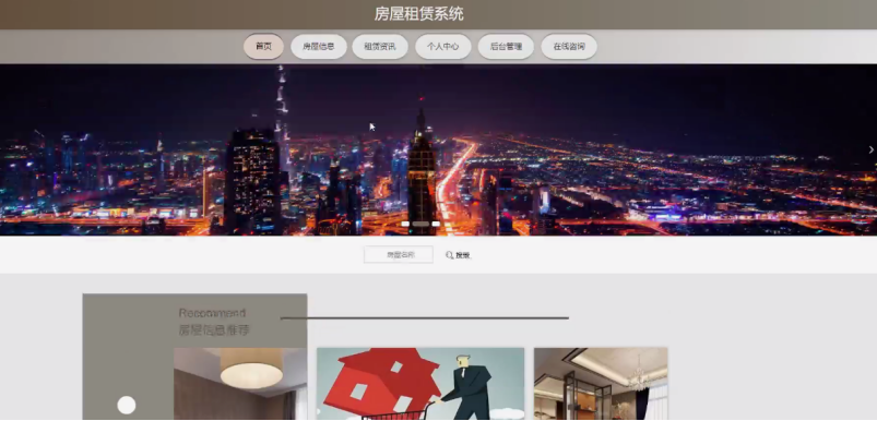 前台:首页、房屋信息、租赁资讯、个人中心、后台管理、在线咨询等