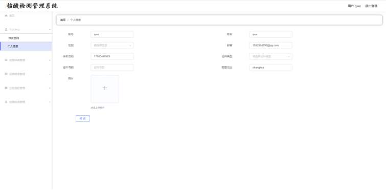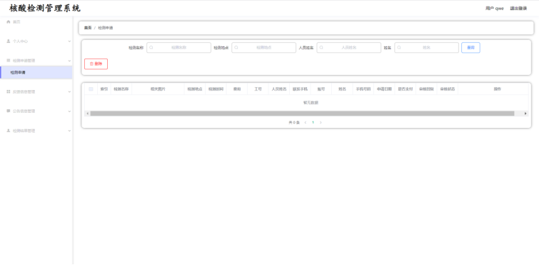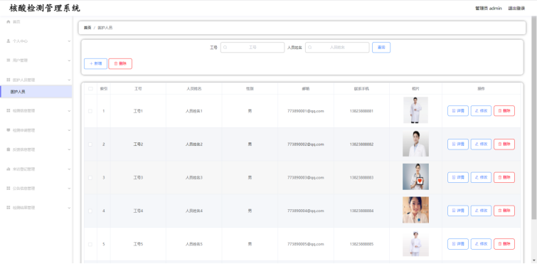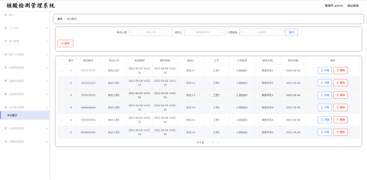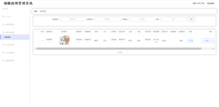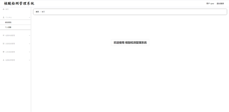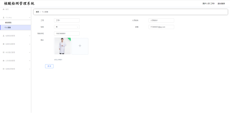 医护人员:首页,个人中心,检测信息管理,检测申请管理,来访登记管理,公告信息管理等