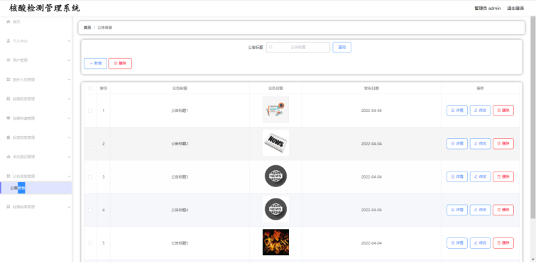 管理员:首页,个人中心,用户管理,医护人员管理,检测信息管理,检测申请管理,反馈信息管理,来访等机构康,公告信息管理等