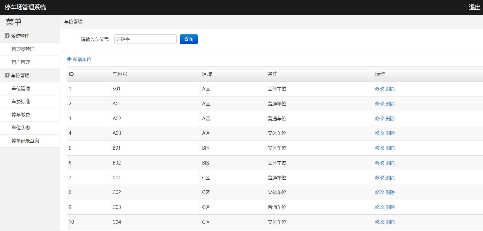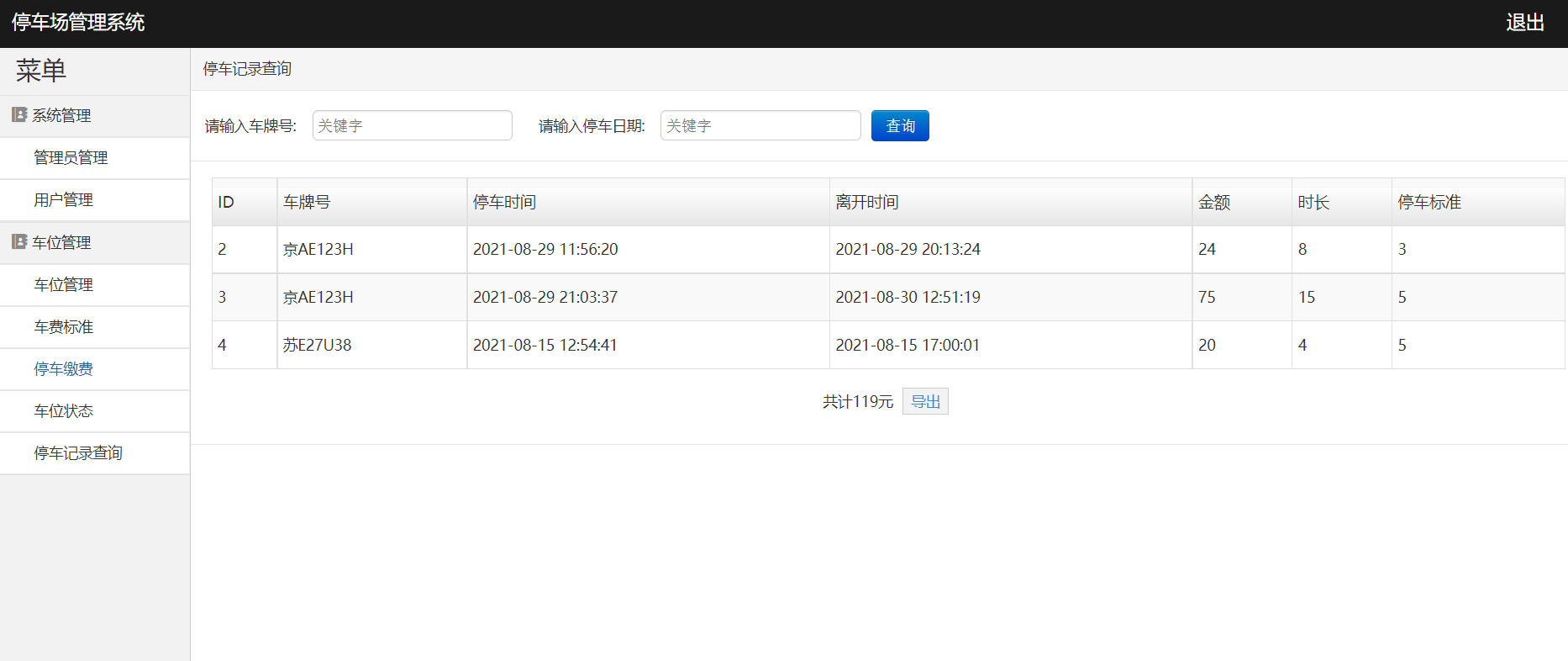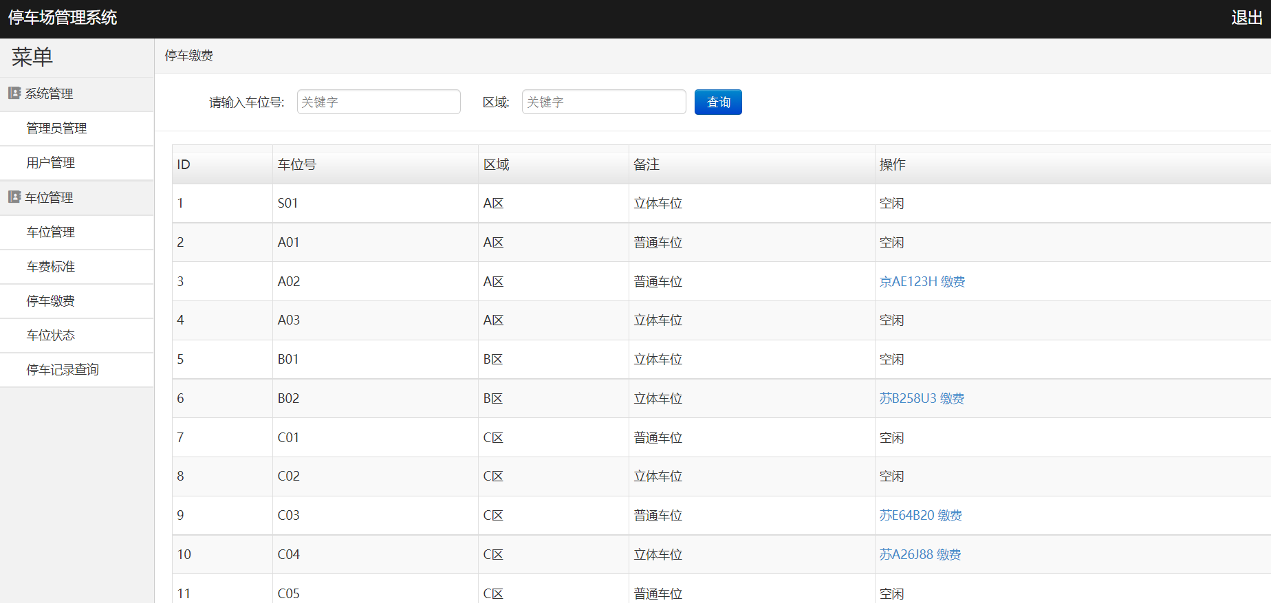 系统登陆、管理员管理、用户管理、用户卡充值、车位管理、车费标准、停车缴费、车位状态、停车记录查询、导出数据、退出登陆等功能。