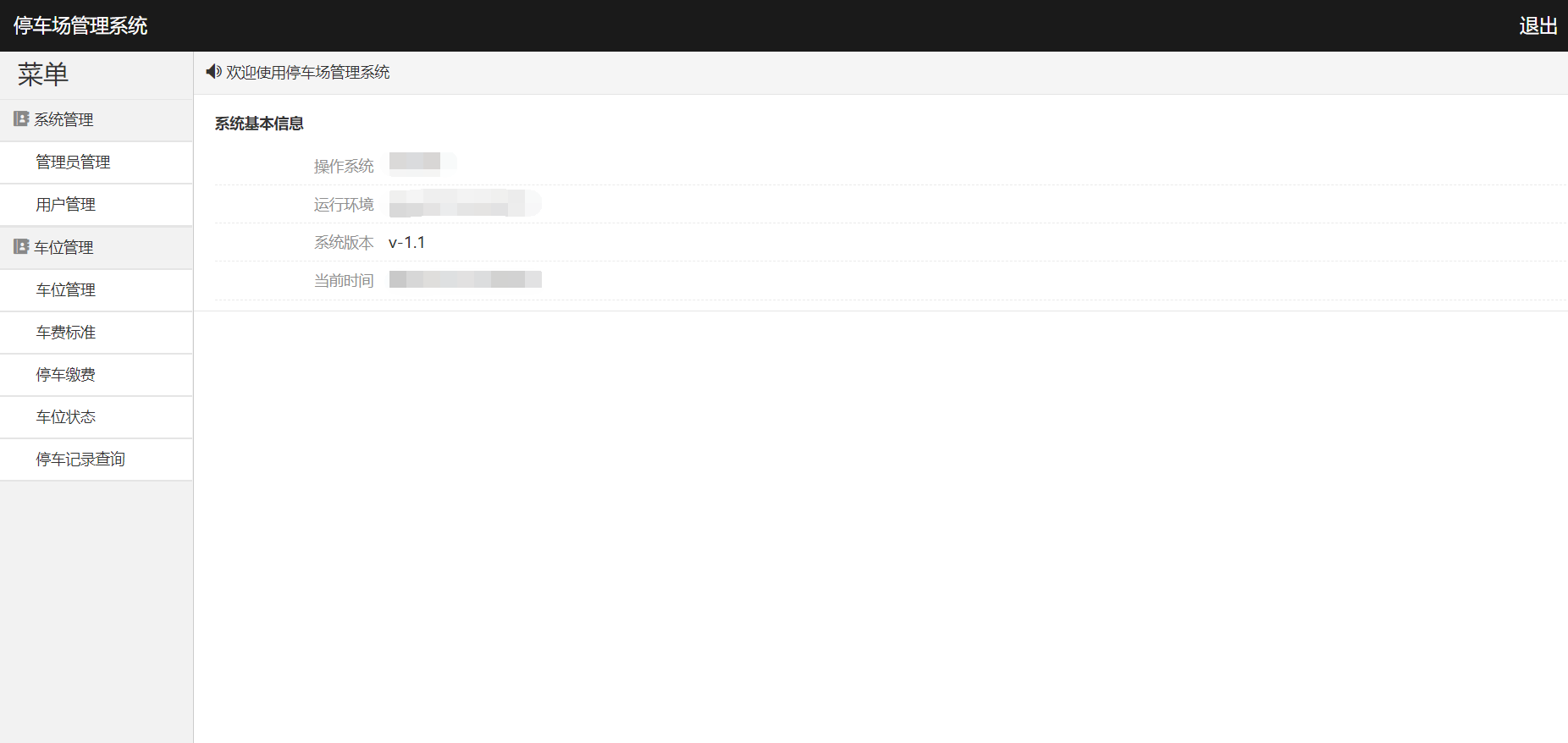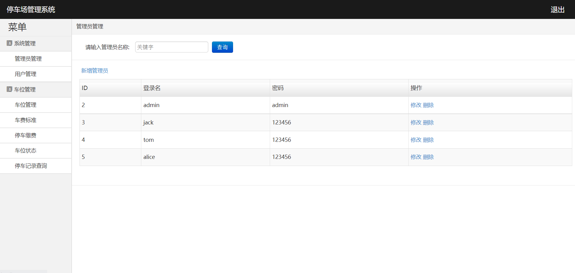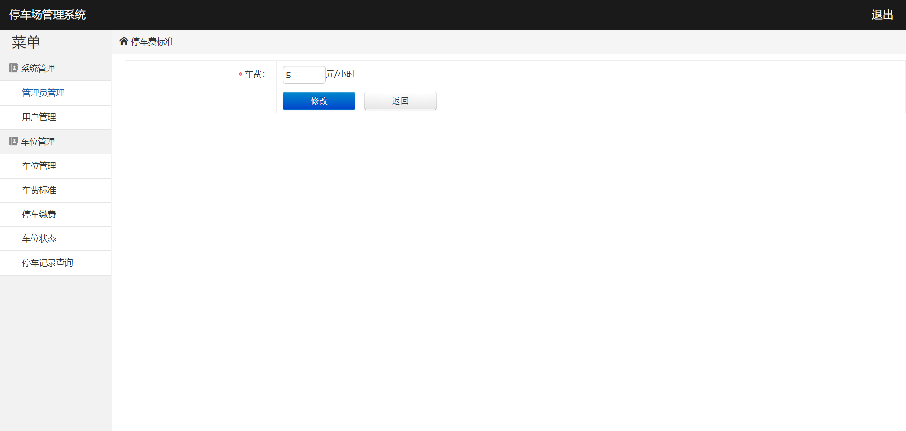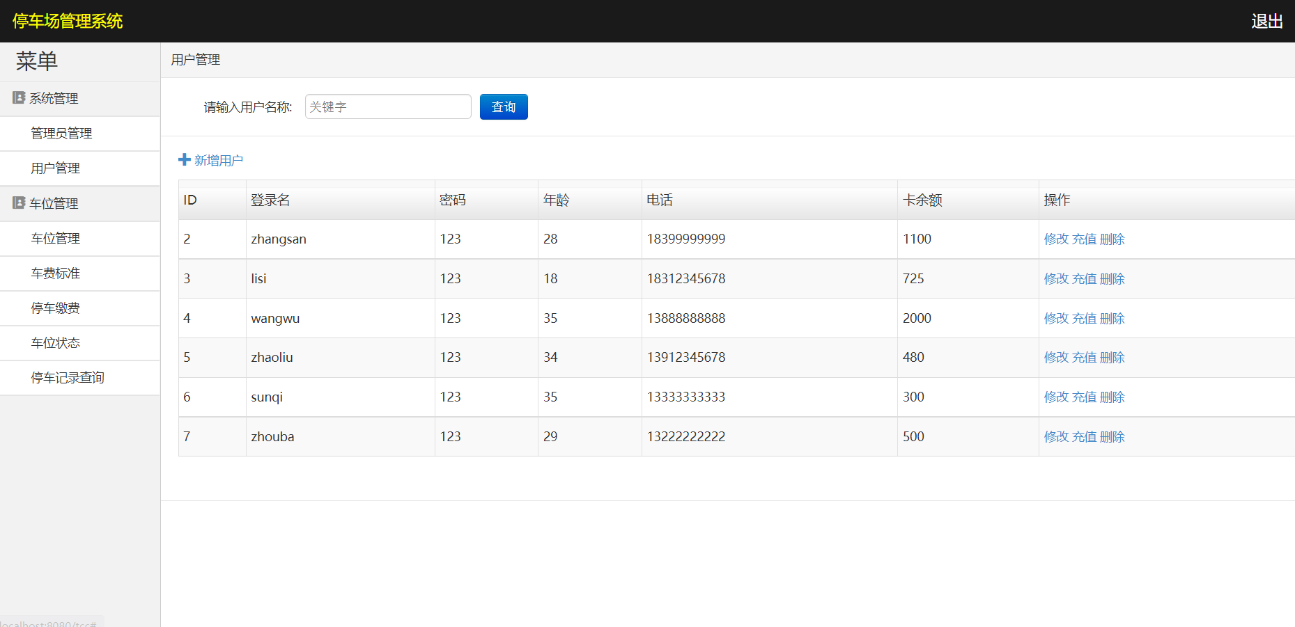 系统登陆、管理员管理、用户管理、用户卡充值、车位管理、车费标准、停车缴费、车位状态、停车记录查询、导出数据、退出登陆等功能。