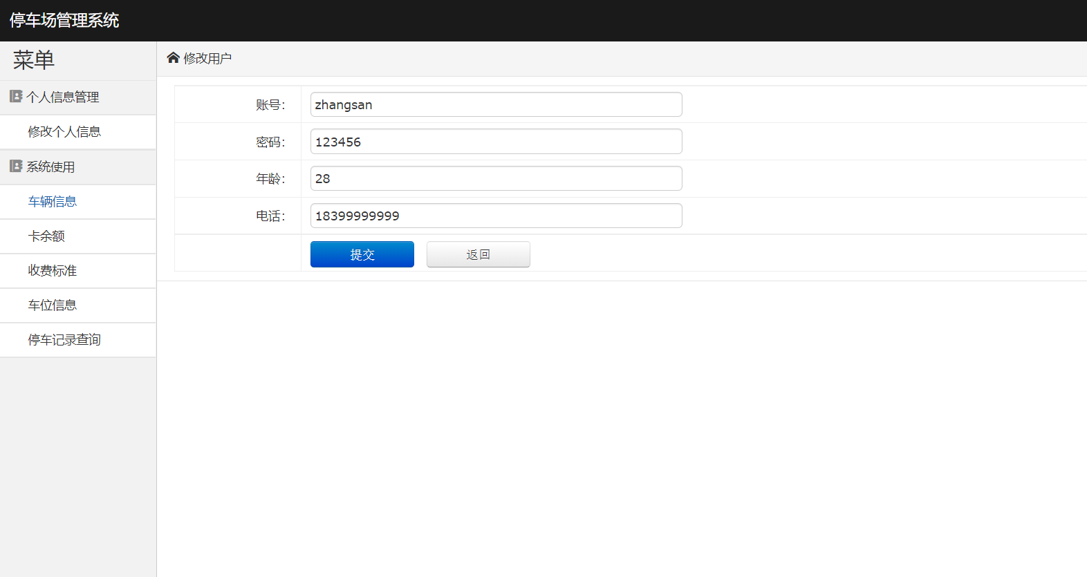 用户登陆、修改个人信息、车辆信息、卡余额、收费标准、车位信息、预订车位、停车记录查询等功能。