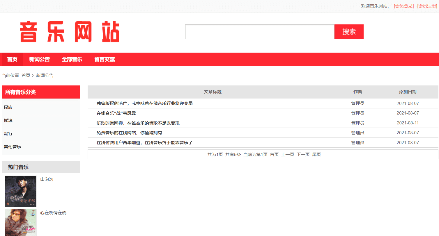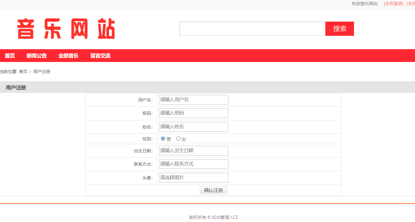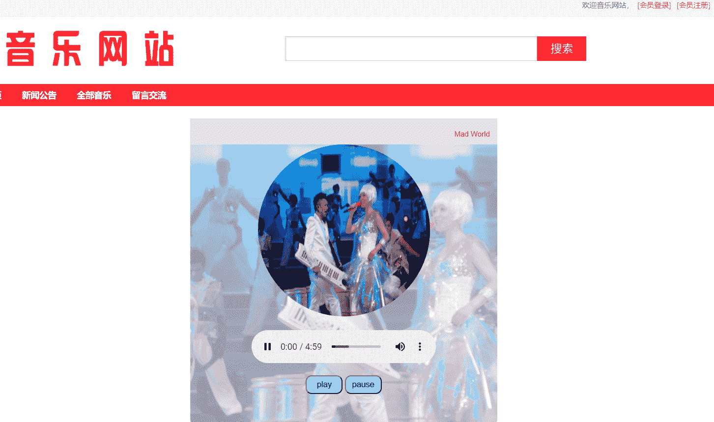 前台首页、音乐浏览、音乐搜索、音乐分类查找、音乐详情、音乐播放、音乐下载、添加收藏、新闻公告、留言交流、用户注册、用户登陆、个人中心、用户信息修改、我的收藏、意见反馈、修改密码等功能。