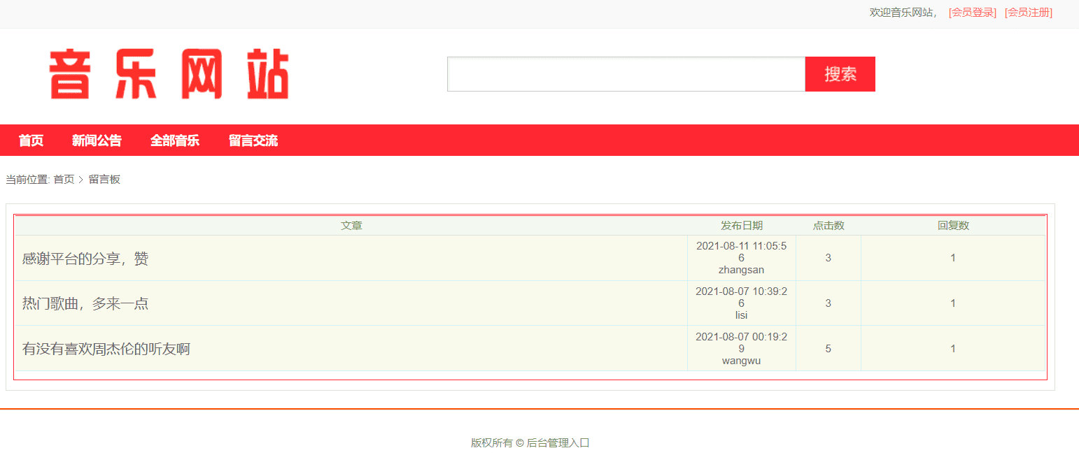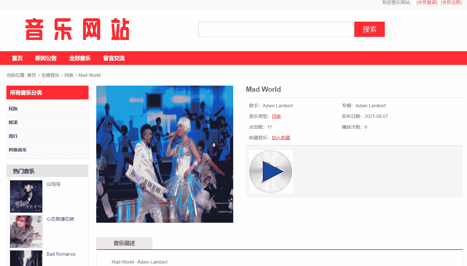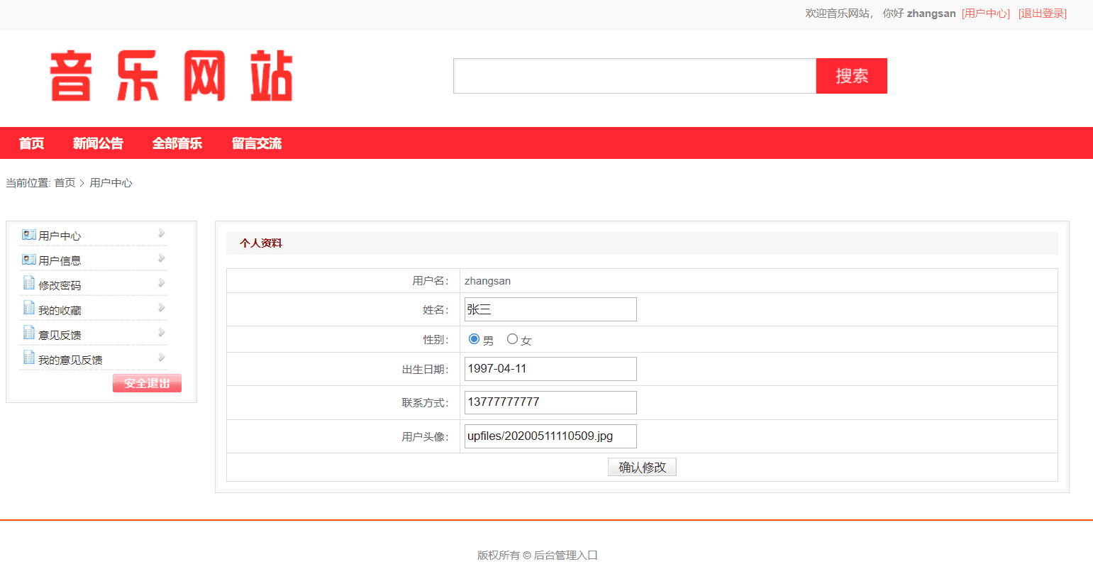 前台首页、音乐浏览、音乐搜索、音乐分类查找、音乐详情、音乐播放、音乐下载、添加收藏、新闻公告、留言交流、用户注册、用户登陆、个人中心、用户信息修改、我的收藏、意见反馈、修改密码等功能。