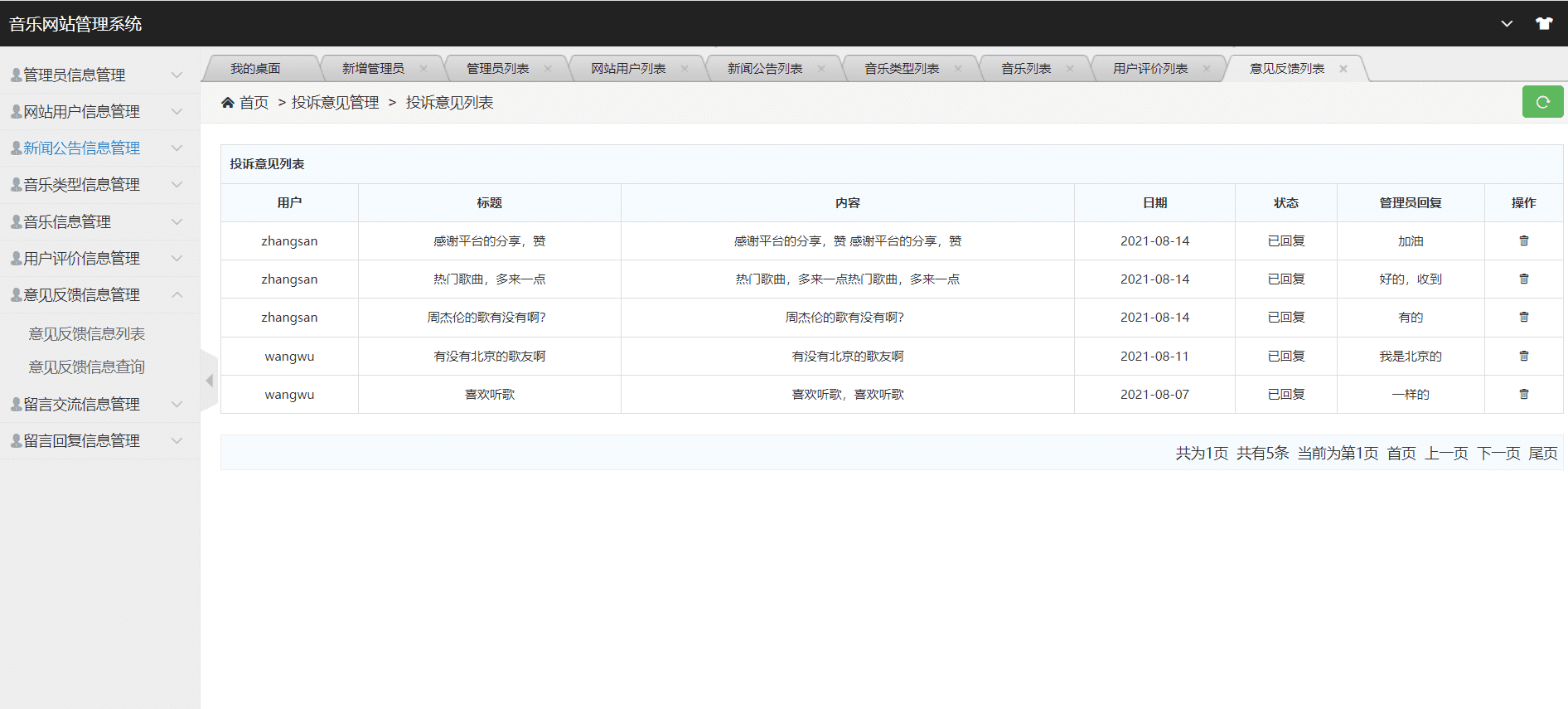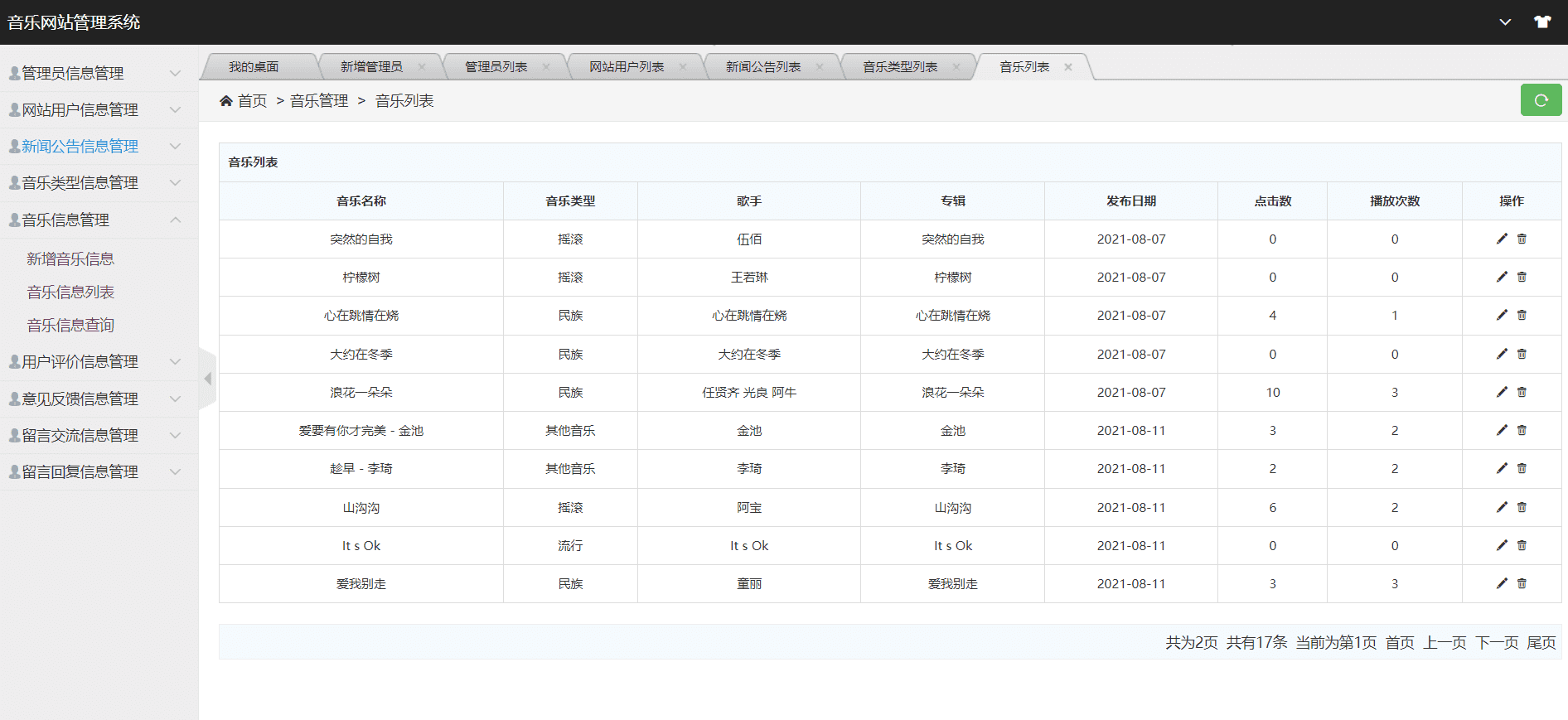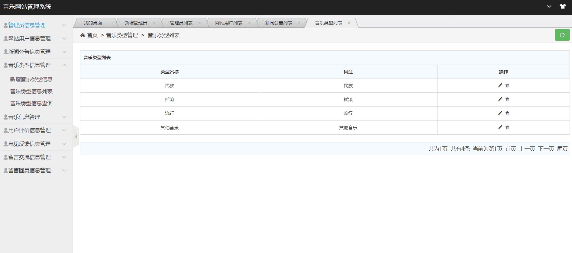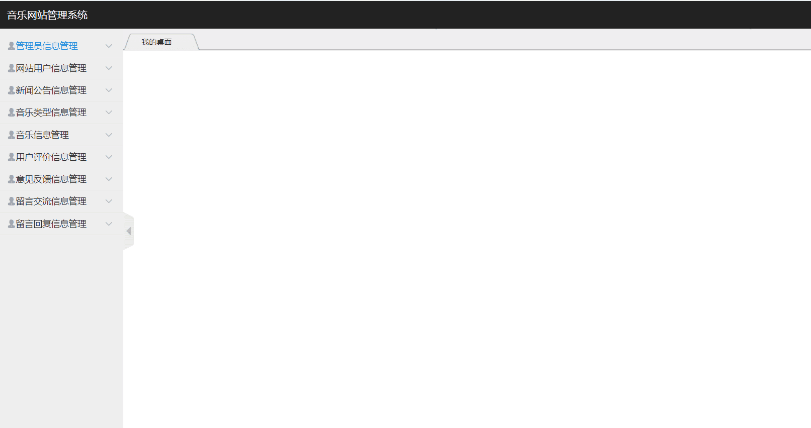 后台系统登陆、管理员管理、用户信息管理、音乐管理、音乐类型管理、新闻公告管理、用户评价管理、意见反馈管理、留言交流管理、消息回复管理等功能。
