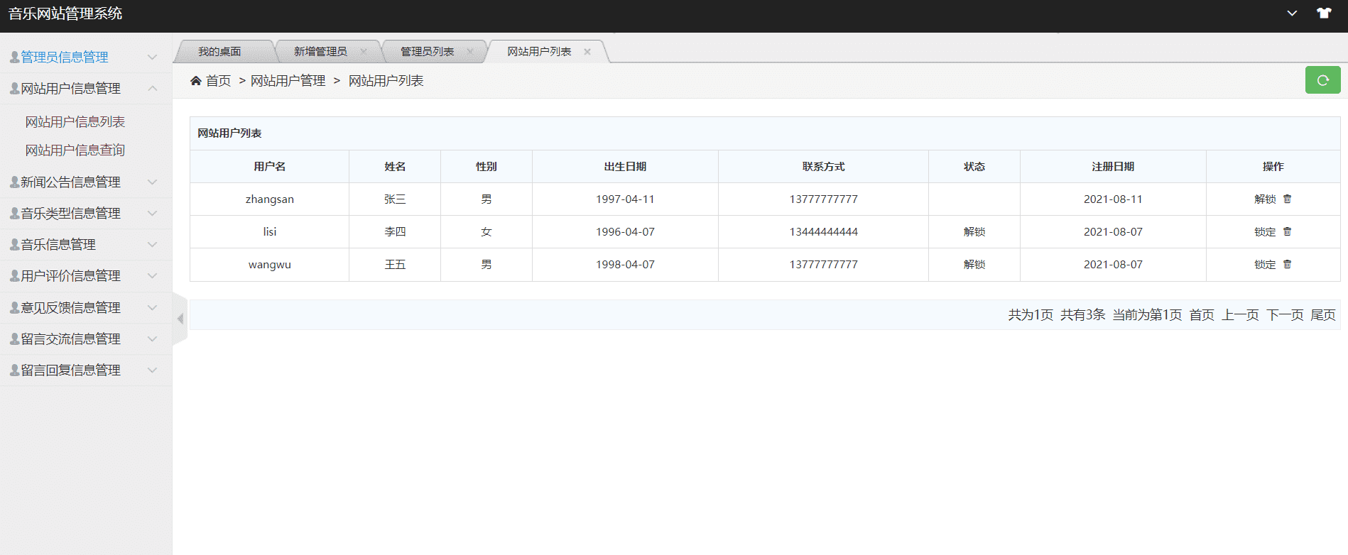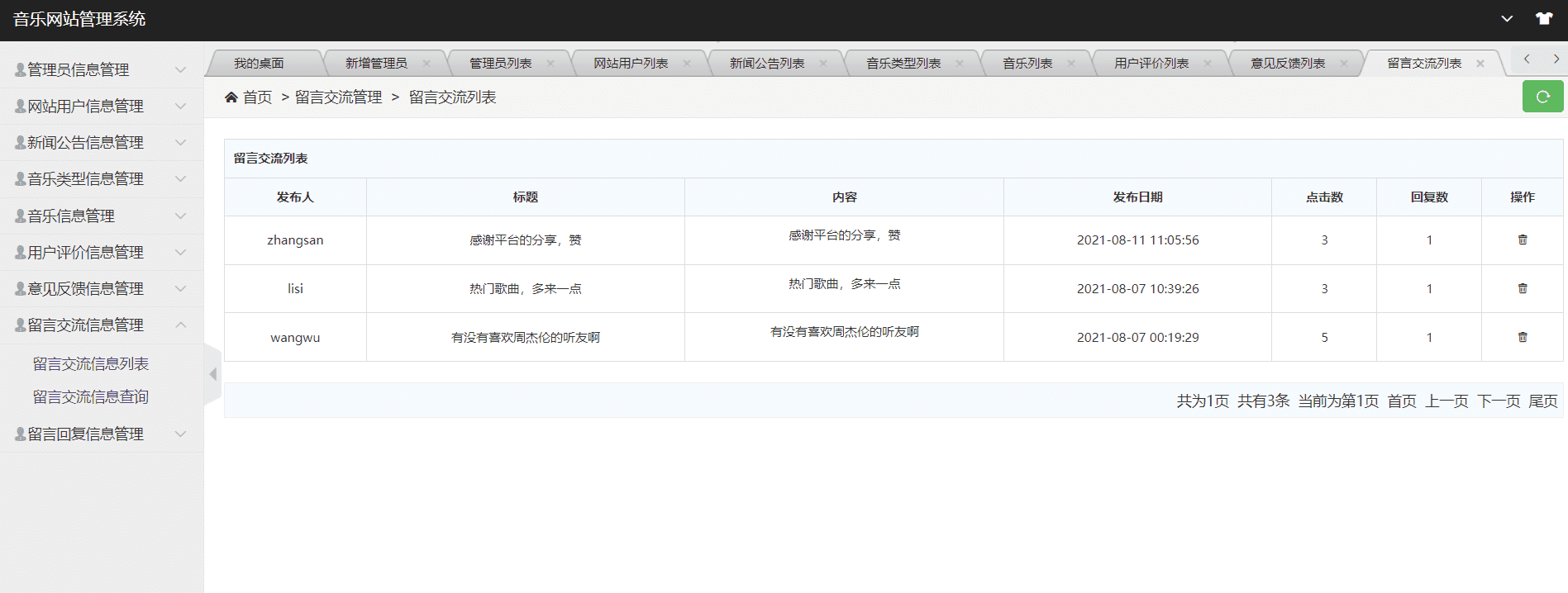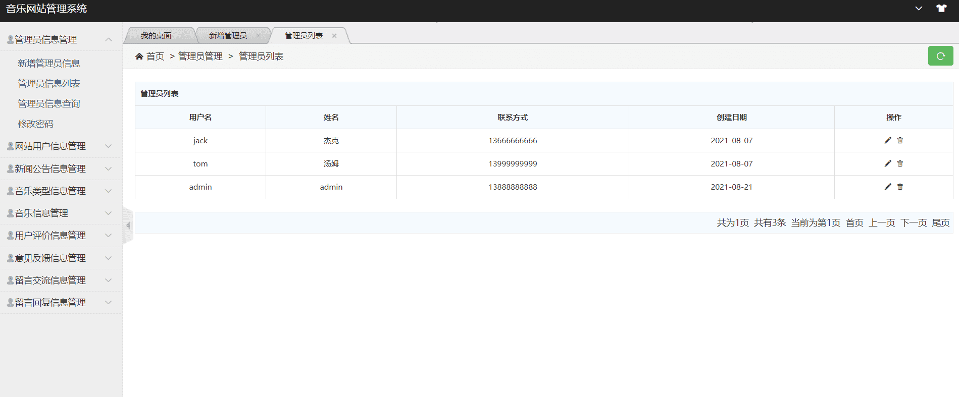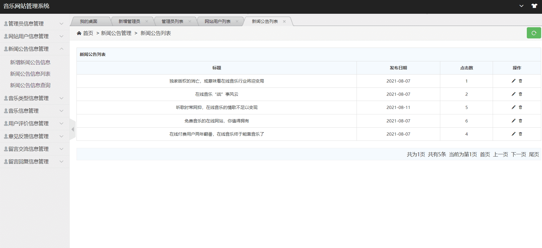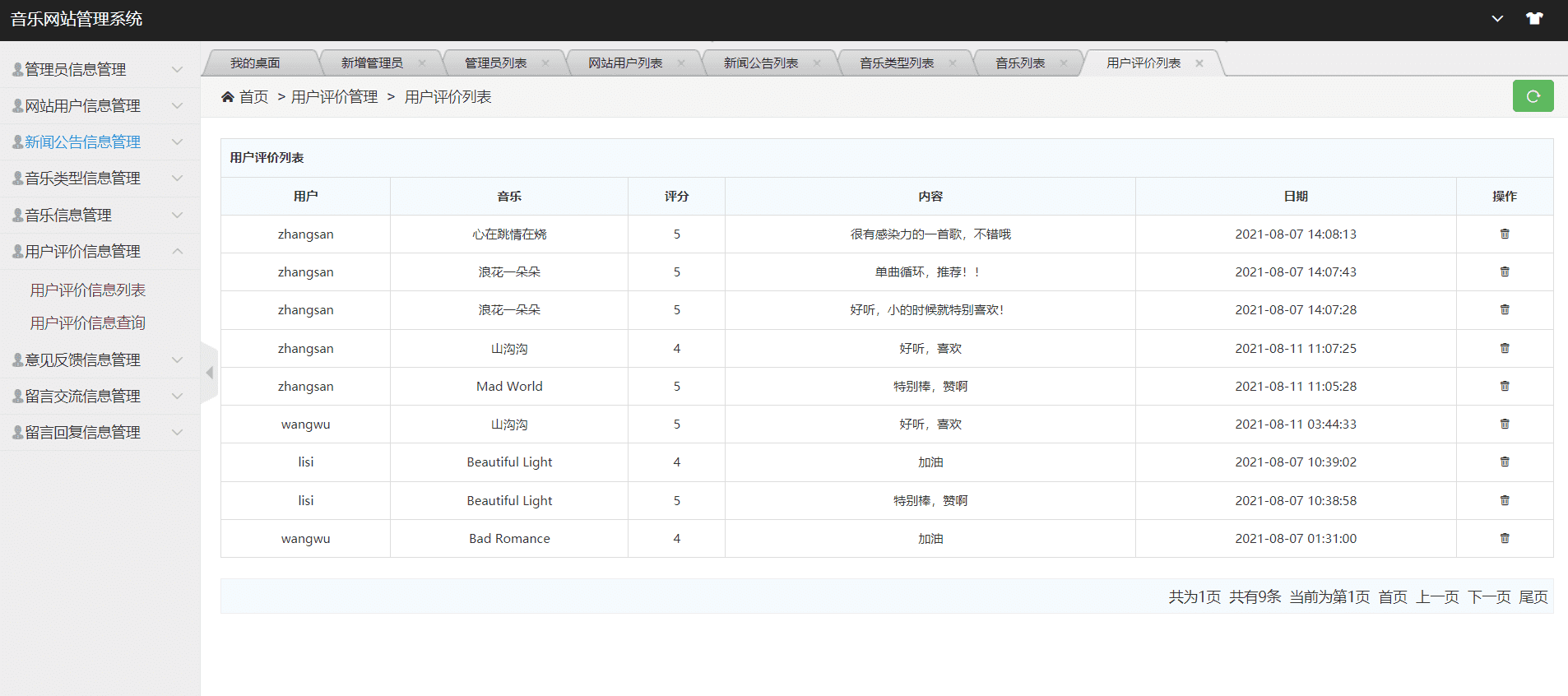 后台系统登陆、管理员管理、用户信息管理、音乐管理、音乐类型管理、新闻公告管理、用户评价管理、意见反馈管理、留言交流管理、消息回复管理等功能。