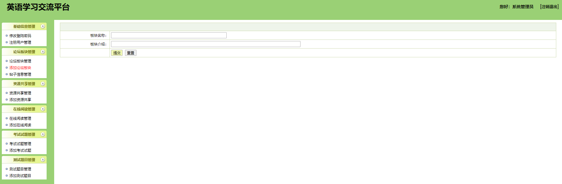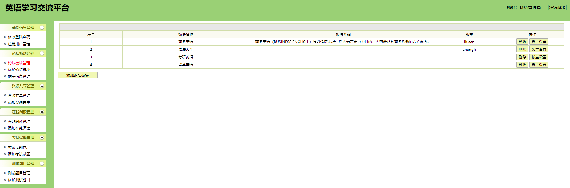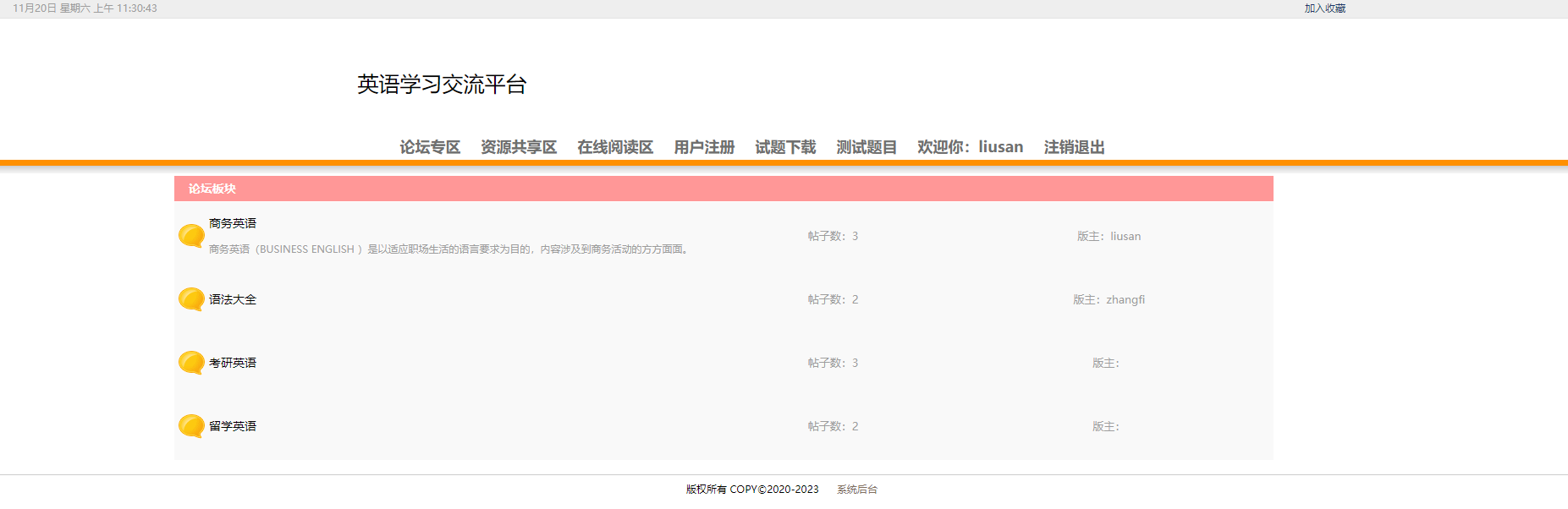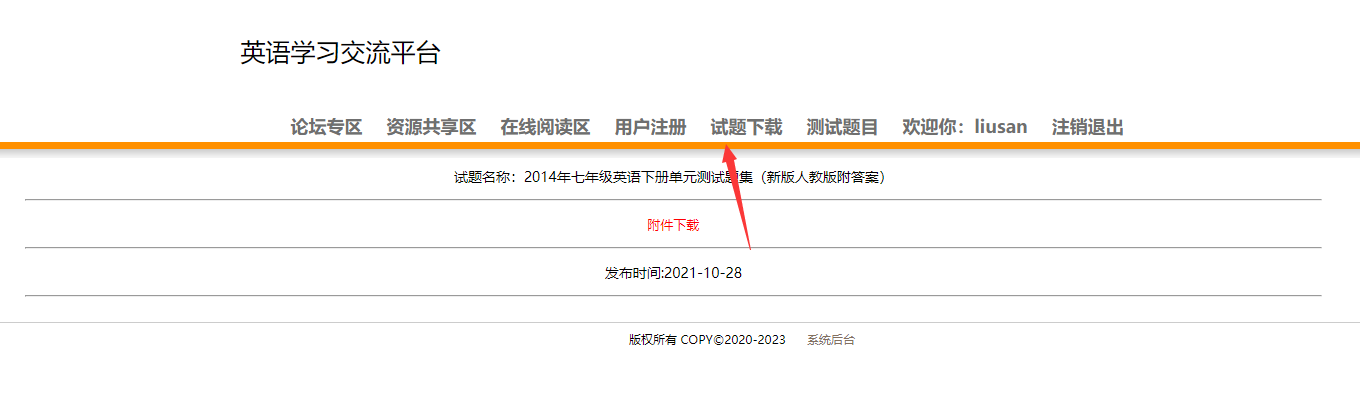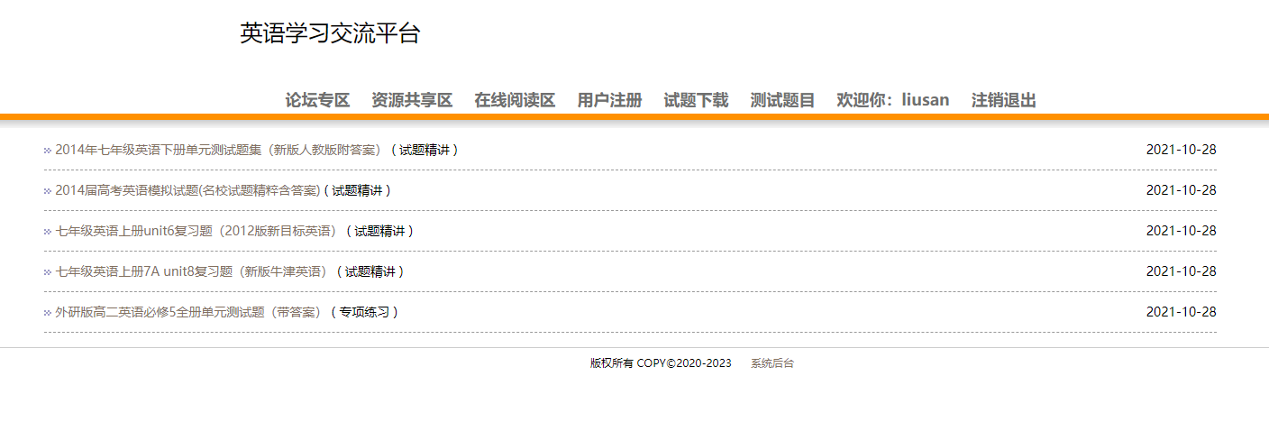 用户:可以注册、登录学习网站,可以在论坛专区发布、回复帖子;可以在资源共享专区下查看并下载各种资源;在线阅读区可以阅读英文文章;试题下载模块可以供用户下载各种经典试题;测试题目可以提供给用户测试,检验学习效果。