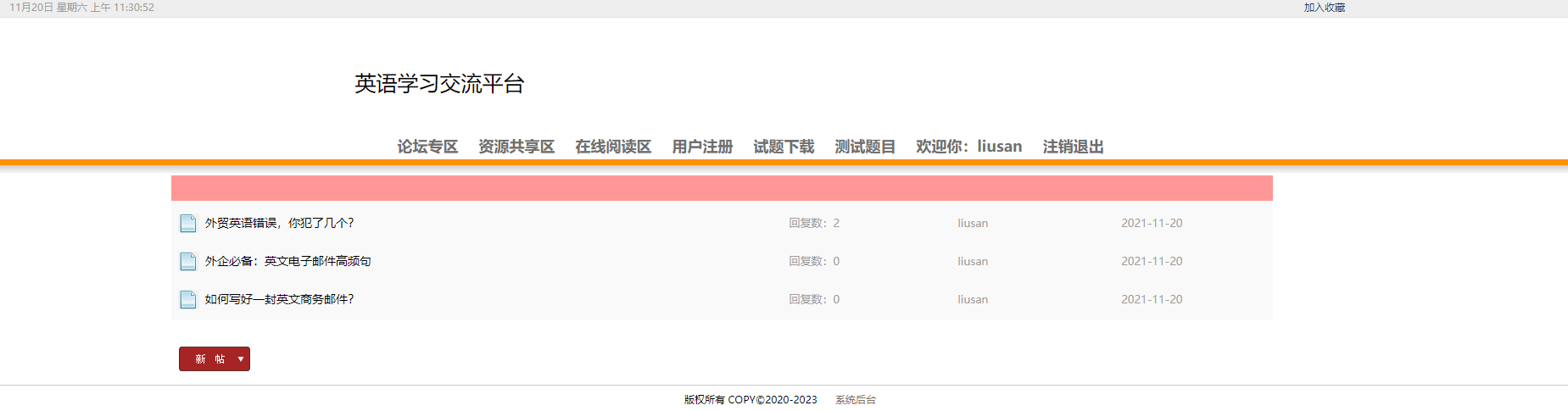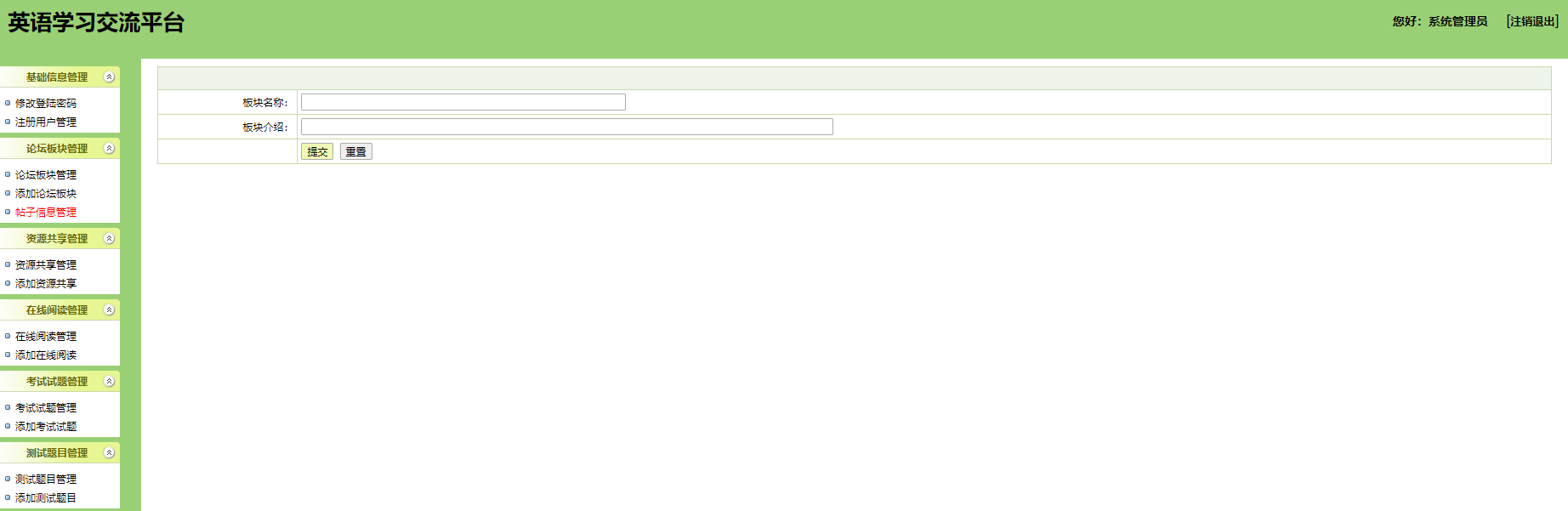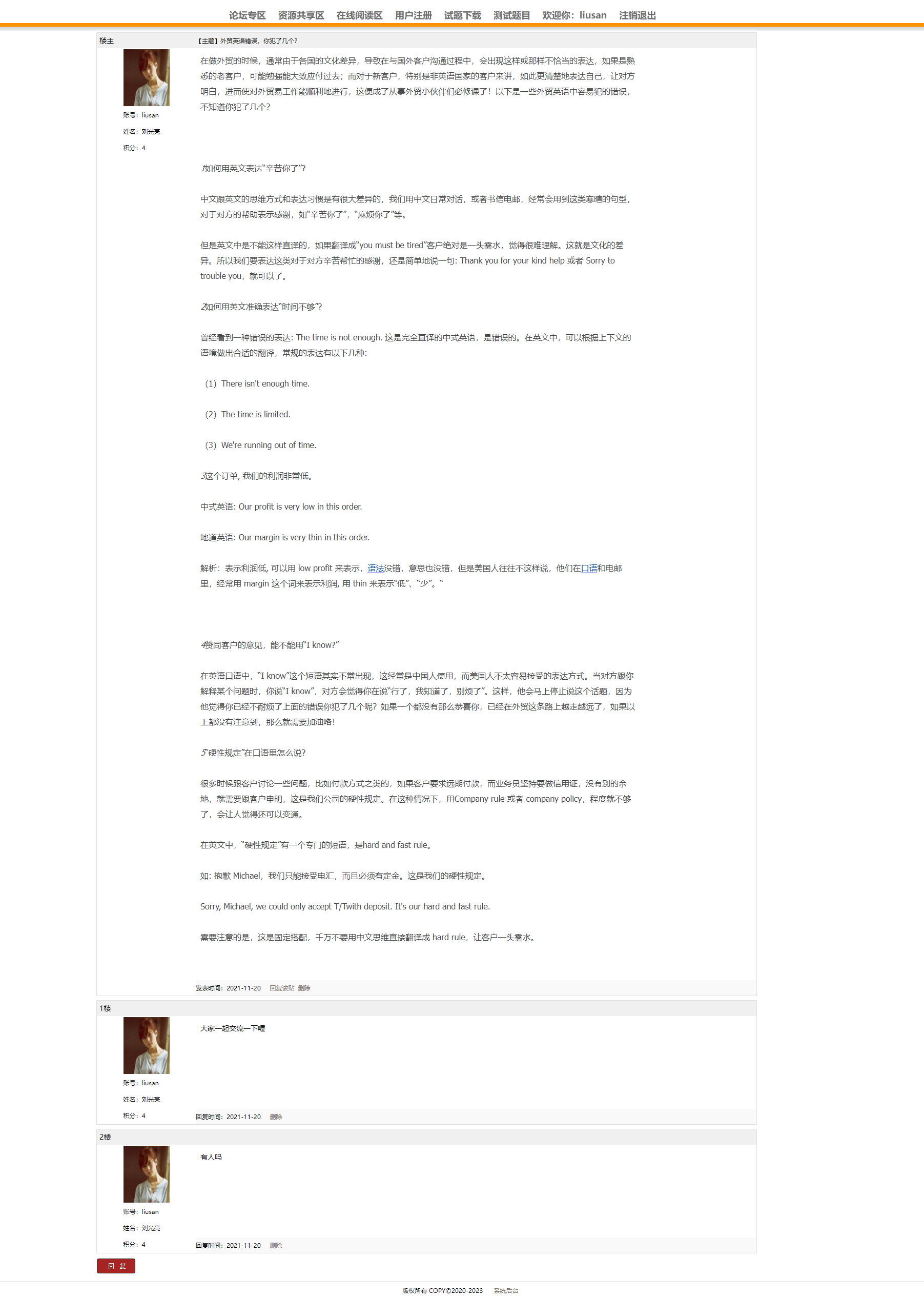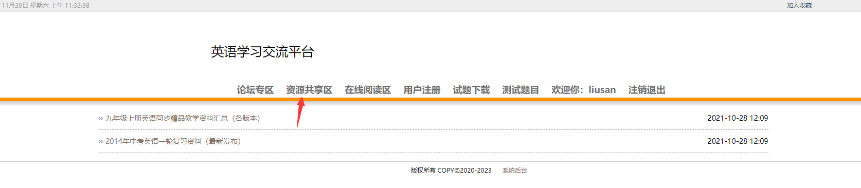 用户:可以注册、登录学习网站,可以在论坛专区发布、回复帖子;可以在资源共享专区下查看并下载各种资源;在线阅读区可以阅读英文文章;试题下载模块可以供用户下载各种经典试题;测试题目可以提供给用户测试,检验学习效果。