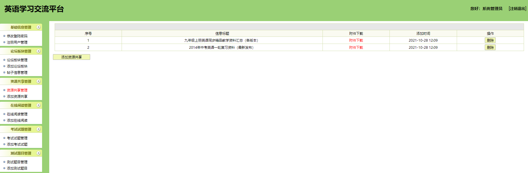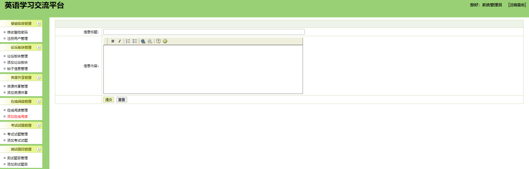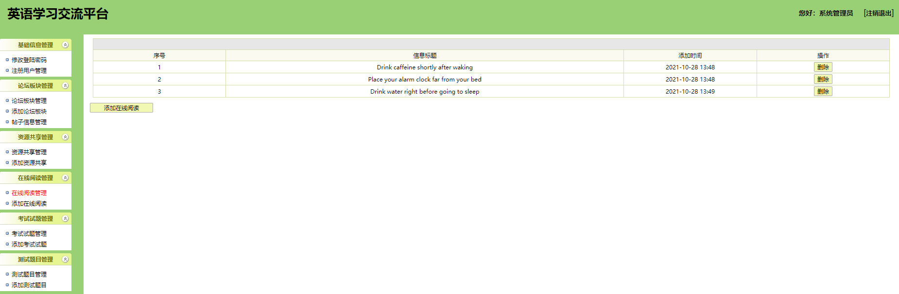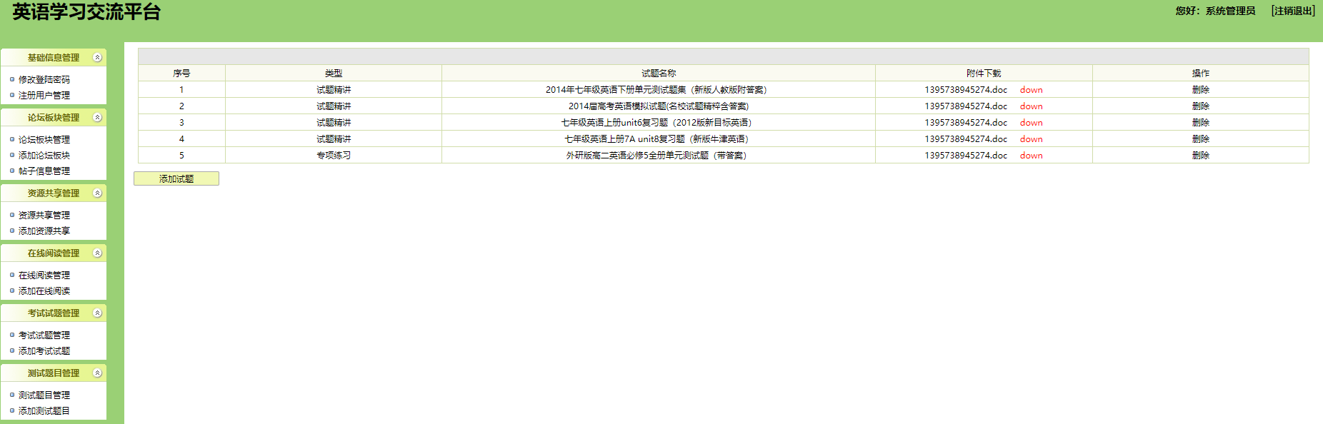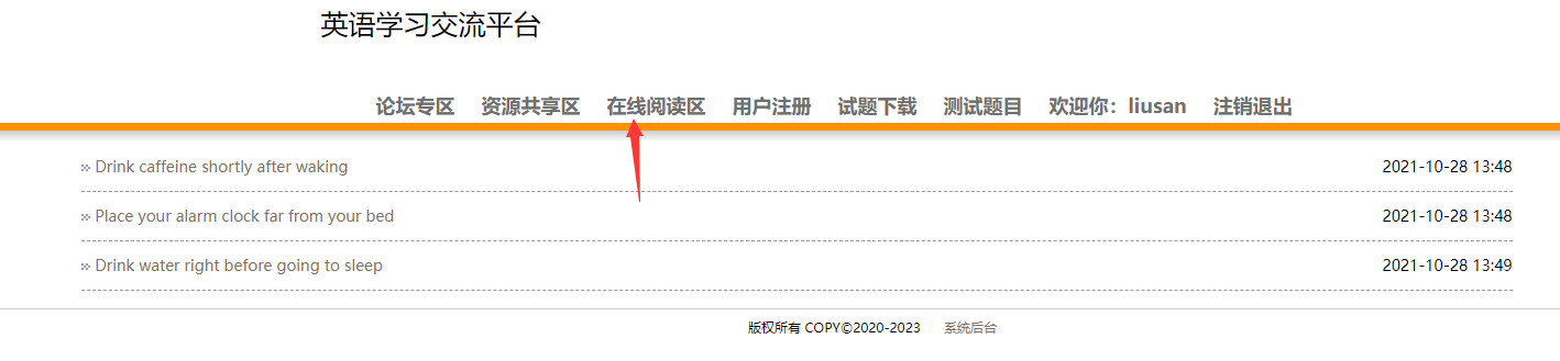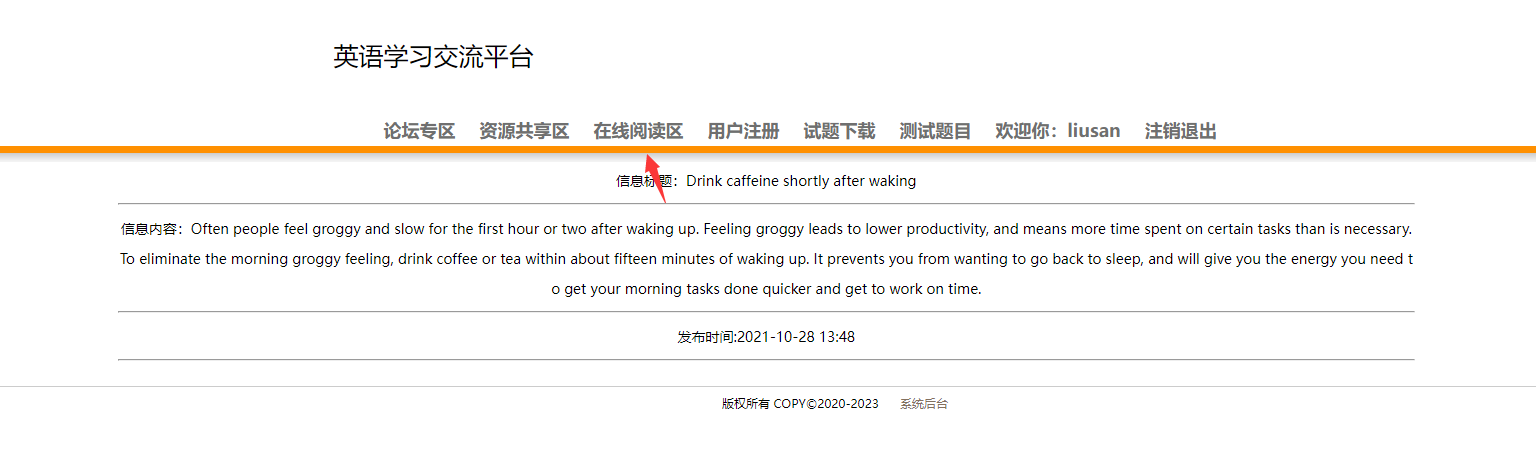 本系统为基于jsp+mysql的在线英语学习网站,包含用户、管理员登录权限,功能如下: