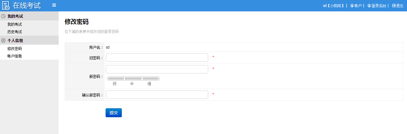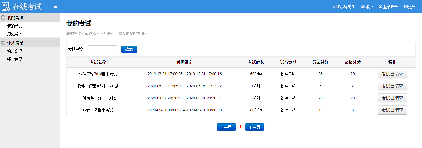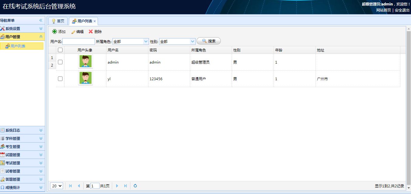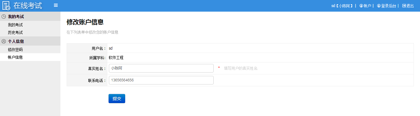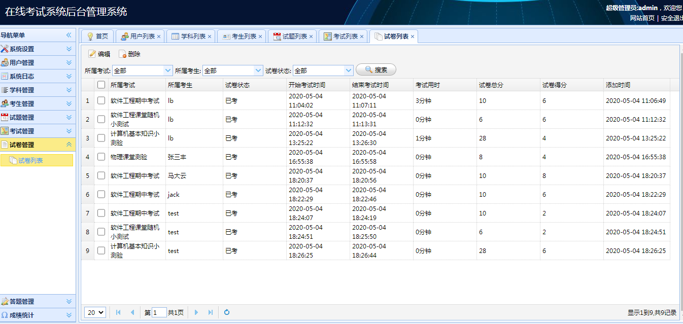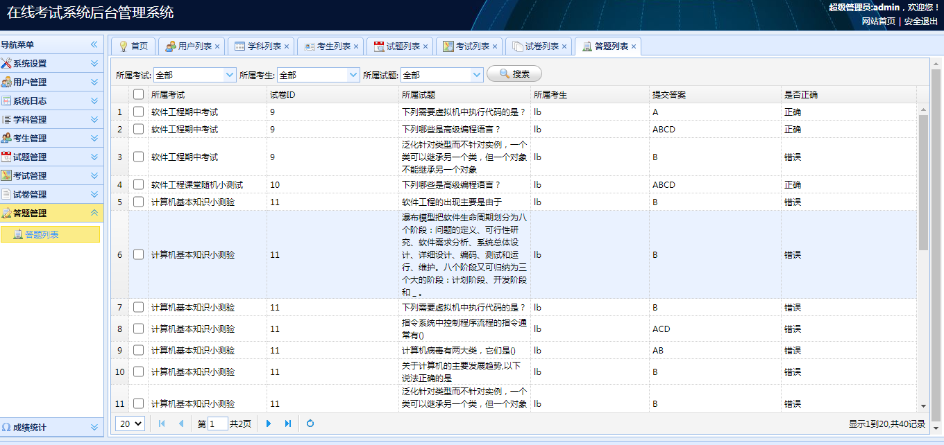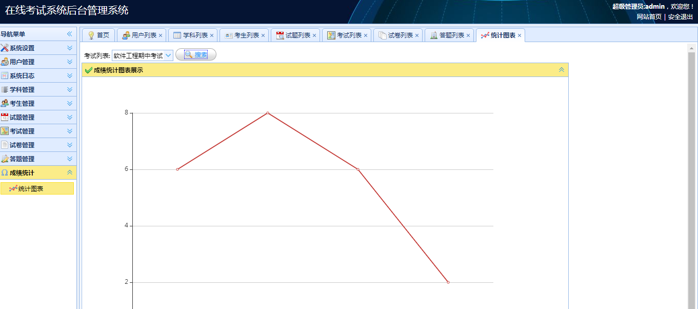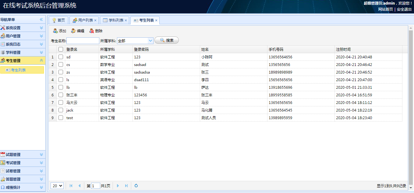 在线考试的功能有:用户前台:用户注册登录、查看考试信息、进行考试、查看考试成绩、查看历史考试记录、回顾已考试卷、修改密码、修改个人信息等,后台管理功能(脚手架功能不在这里列出),科目专业管理、考生管理、试题管理、考试管理、试卷管理、答题详情管理、考试成绩图表统计等,其中试题可以支持批量excel文件导入,试卷试题是随机生成的,每个人的试卷试题都不一样。