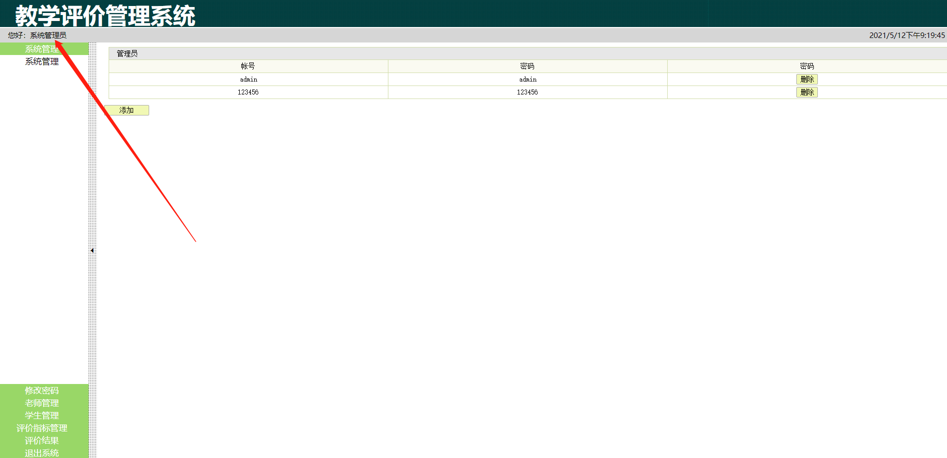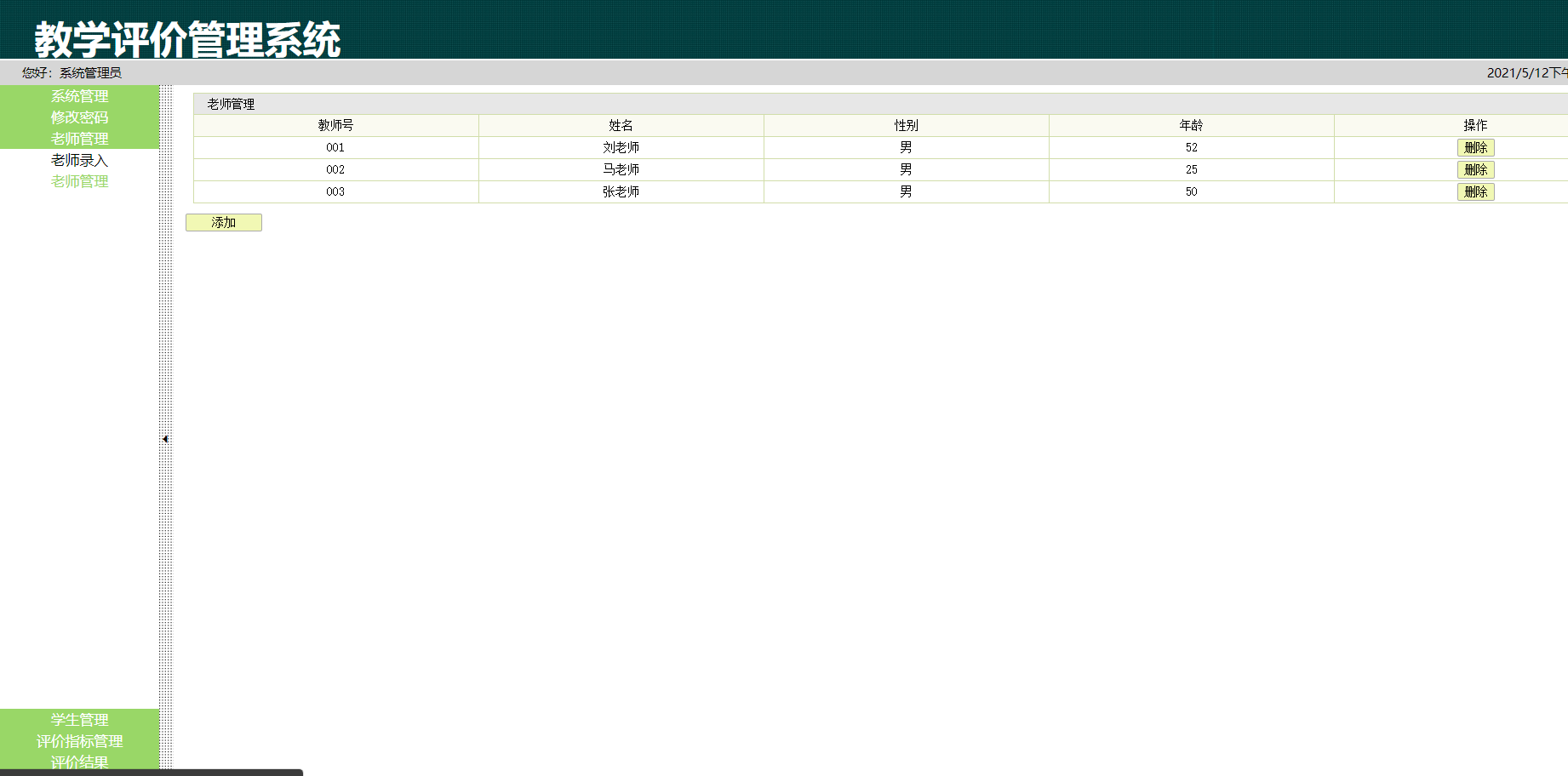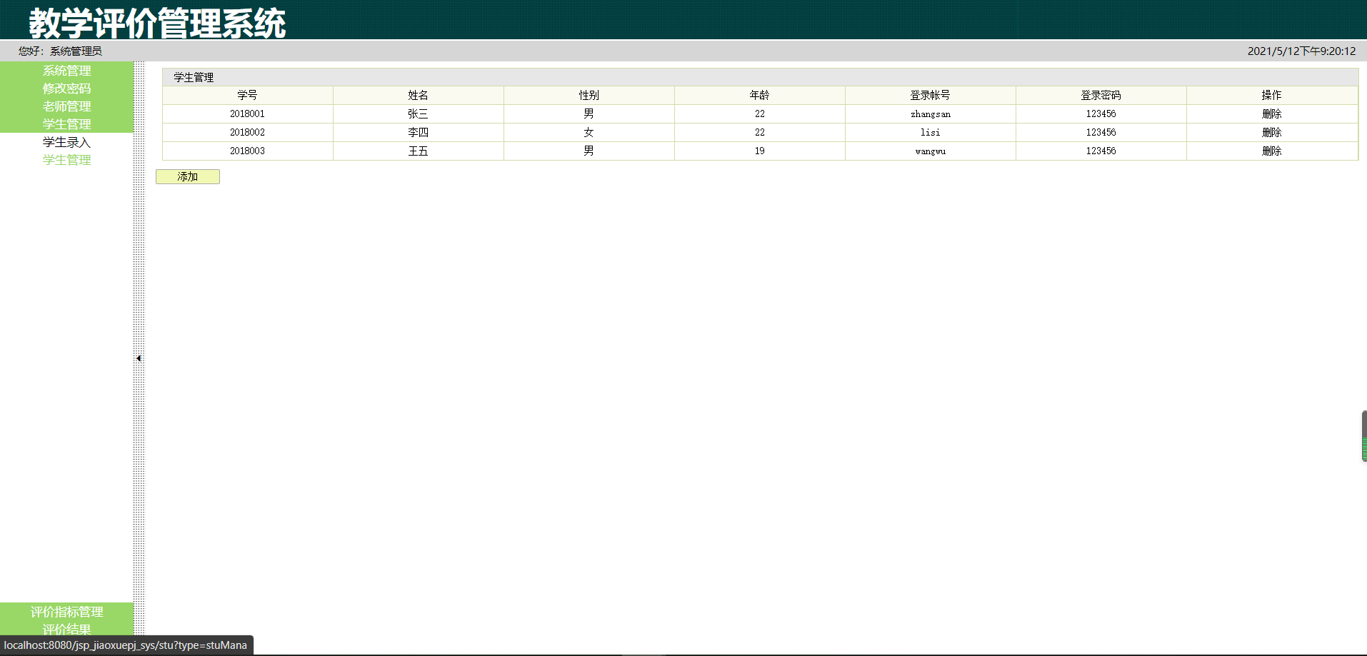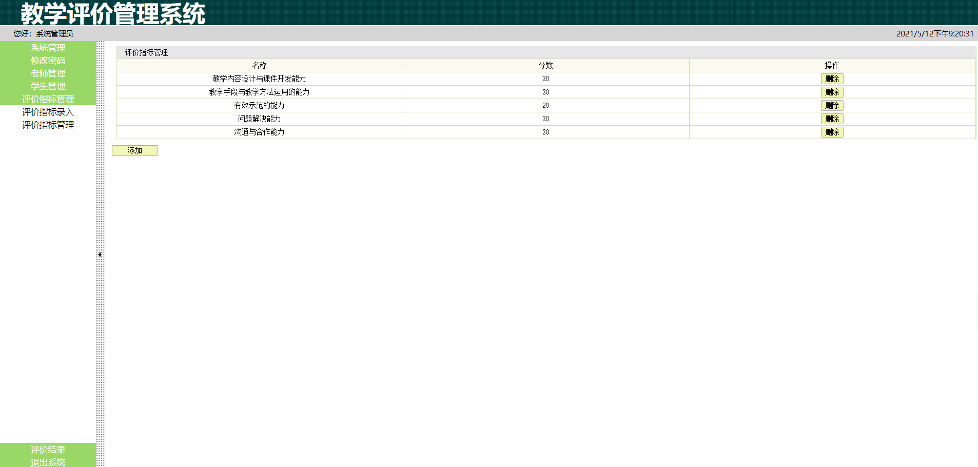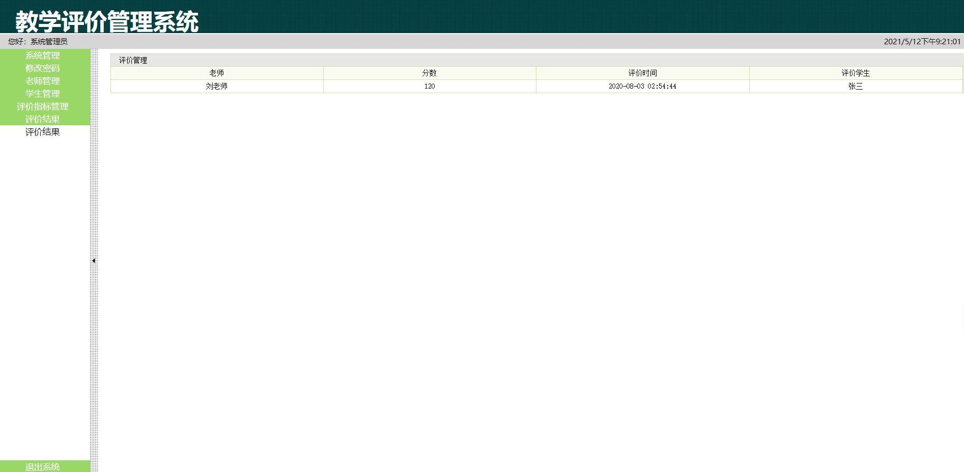 管理员角色功能:管理员登录,管理员管理,修改密码,教师管理,学生管理,评价指标管理,评价结果查看等功能。