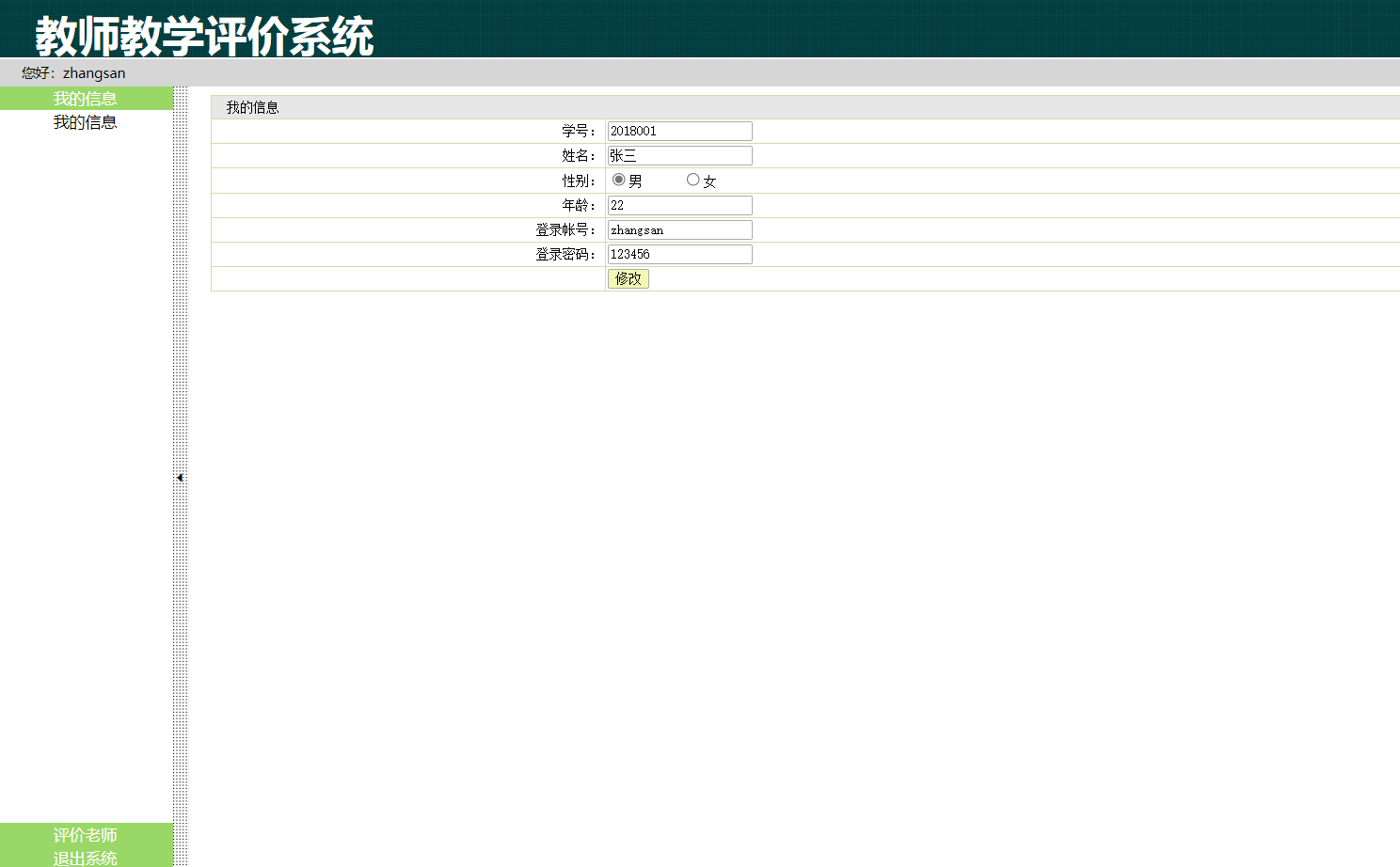 学生角色功能:学生角色登录,个人信息修改,评价某一个老师等功能。