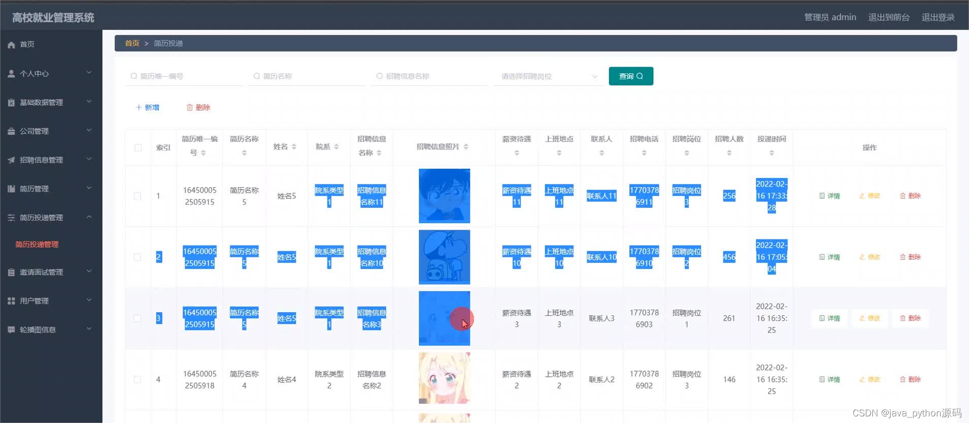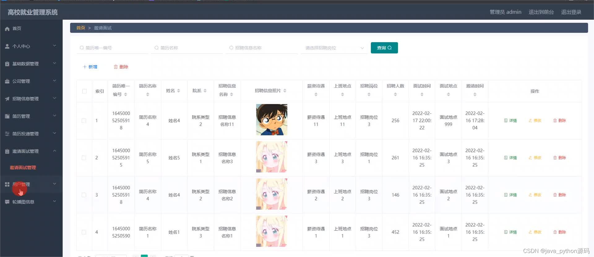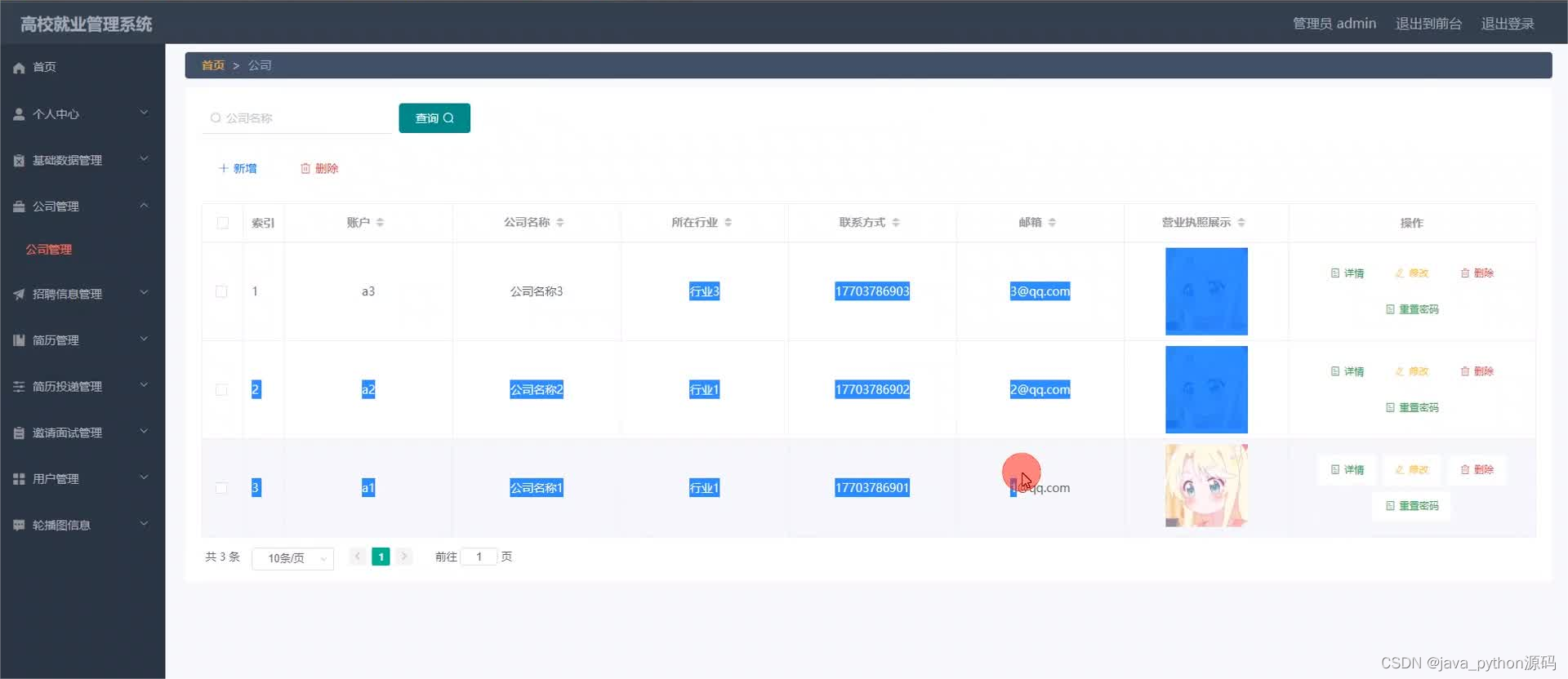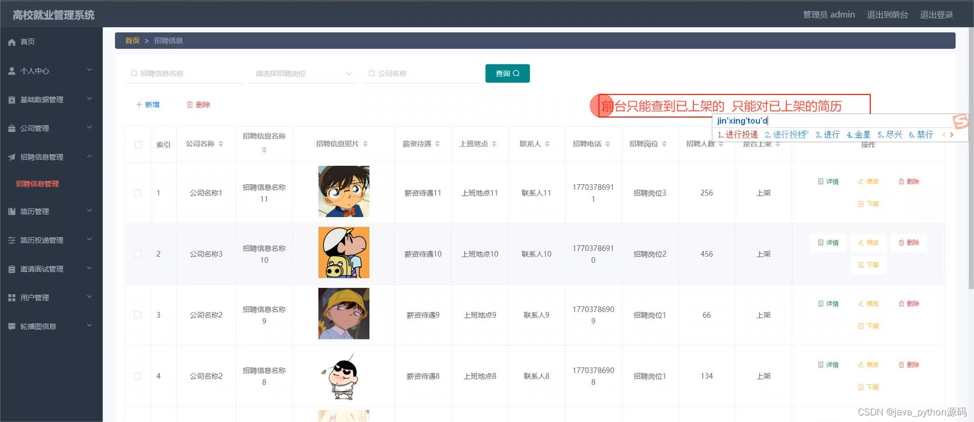 管理员登录进入本系统操作的功能包括对公司,用户,招聘岗位,招聘信息,简历投递信息,简历信息等进行管理