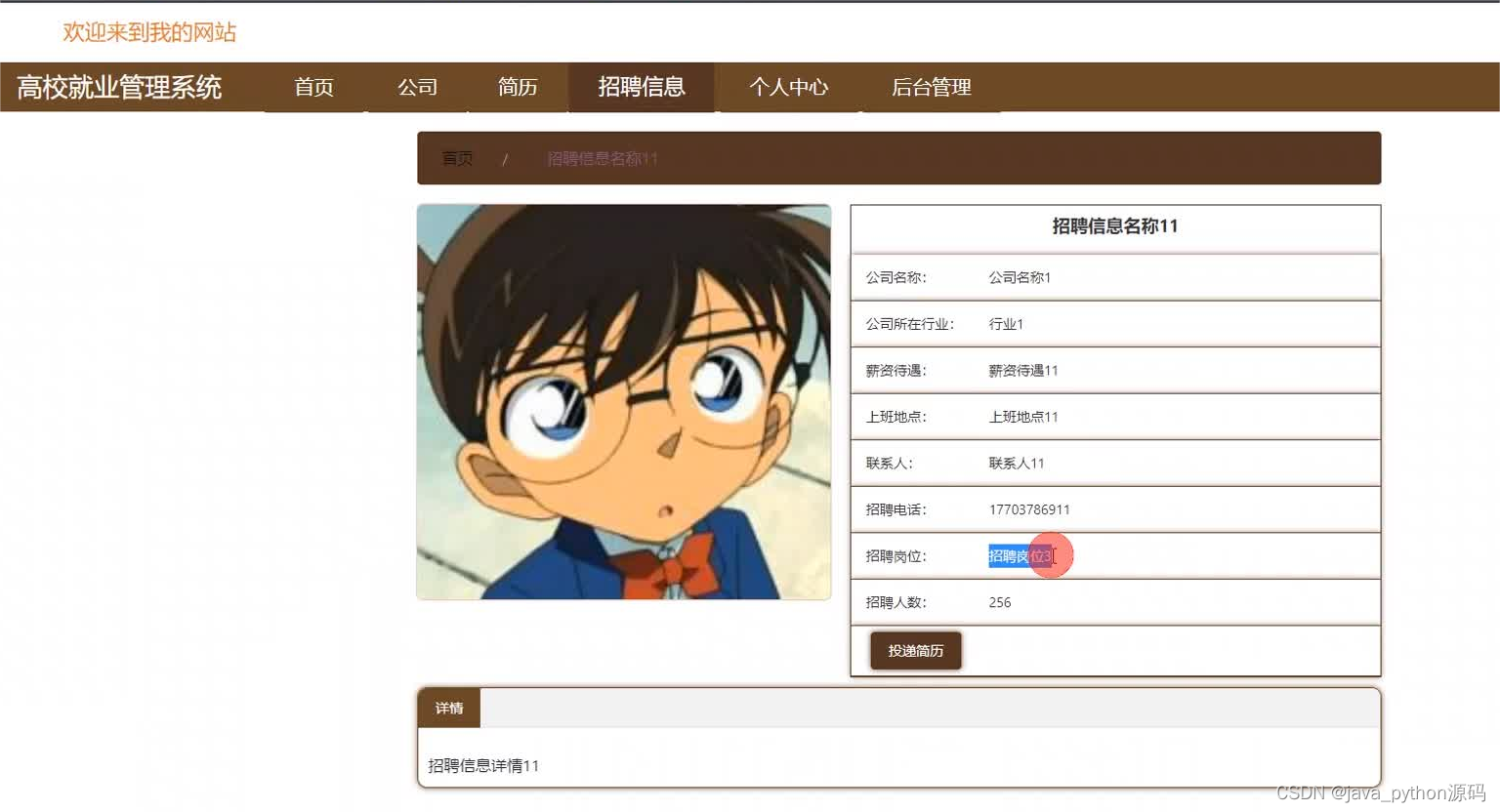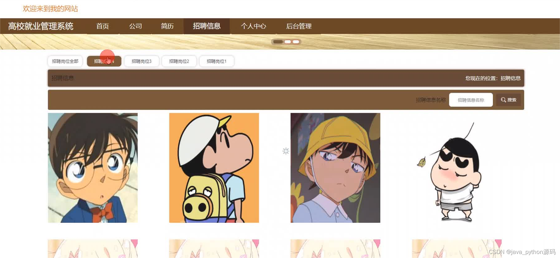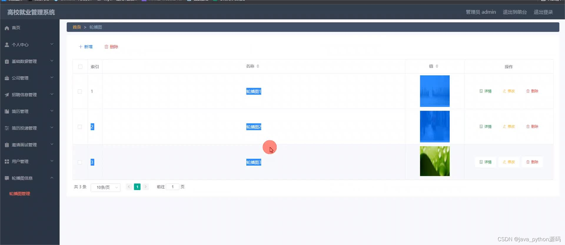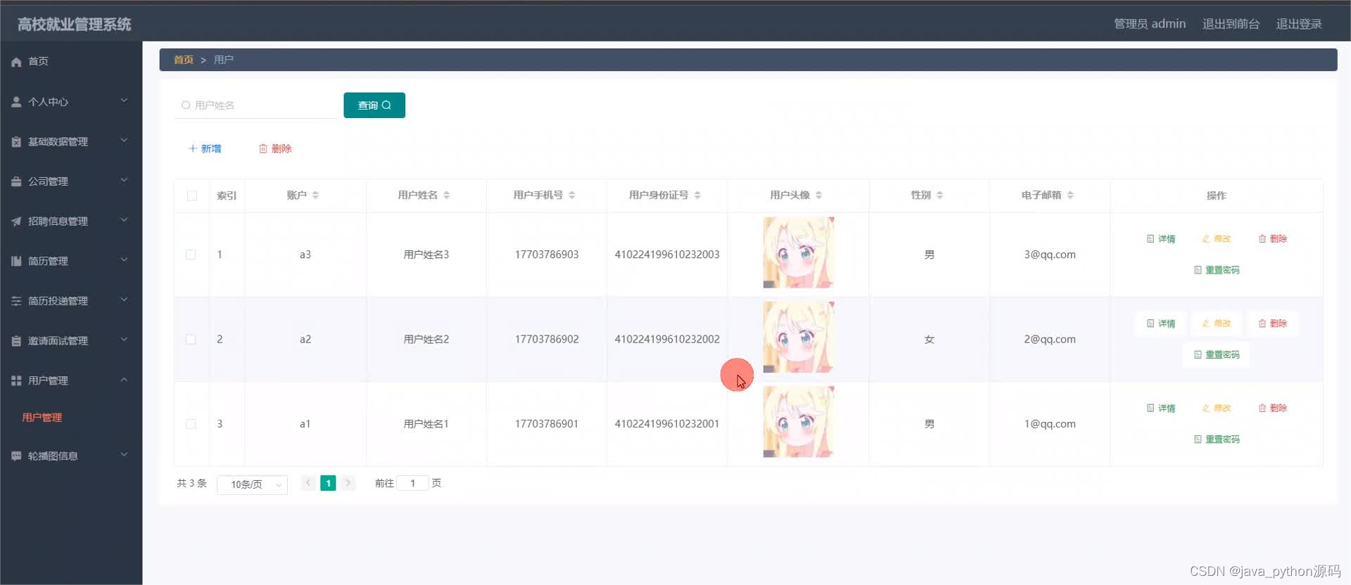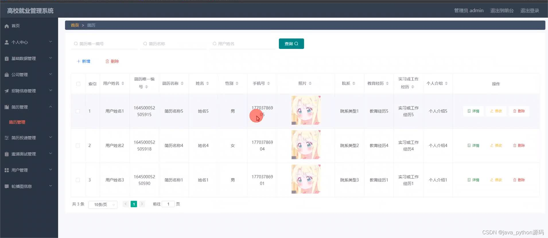 管理员登录进入本系统操作的功能包括对公司,用户,招聘岗位,招聘信息,简历投递信息,简历信息等进行管理