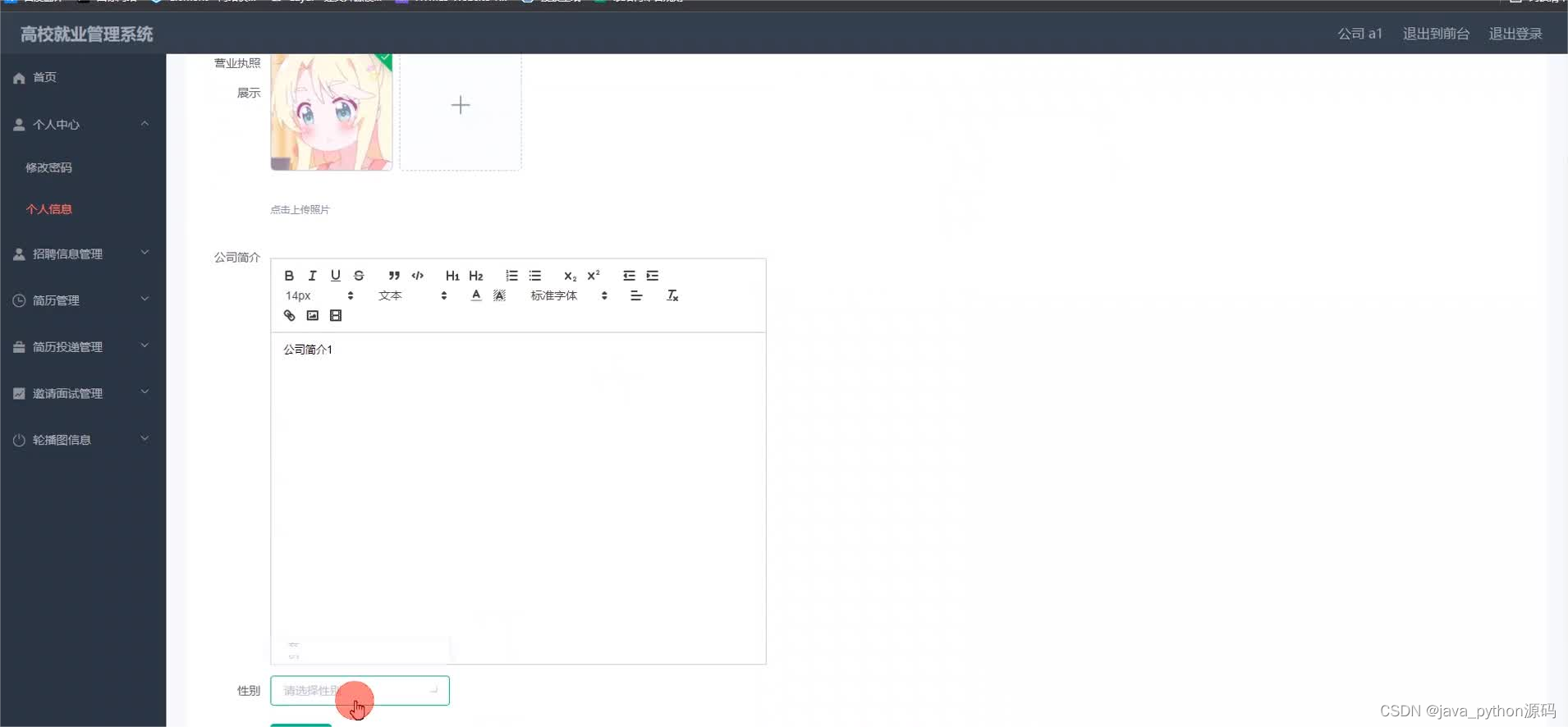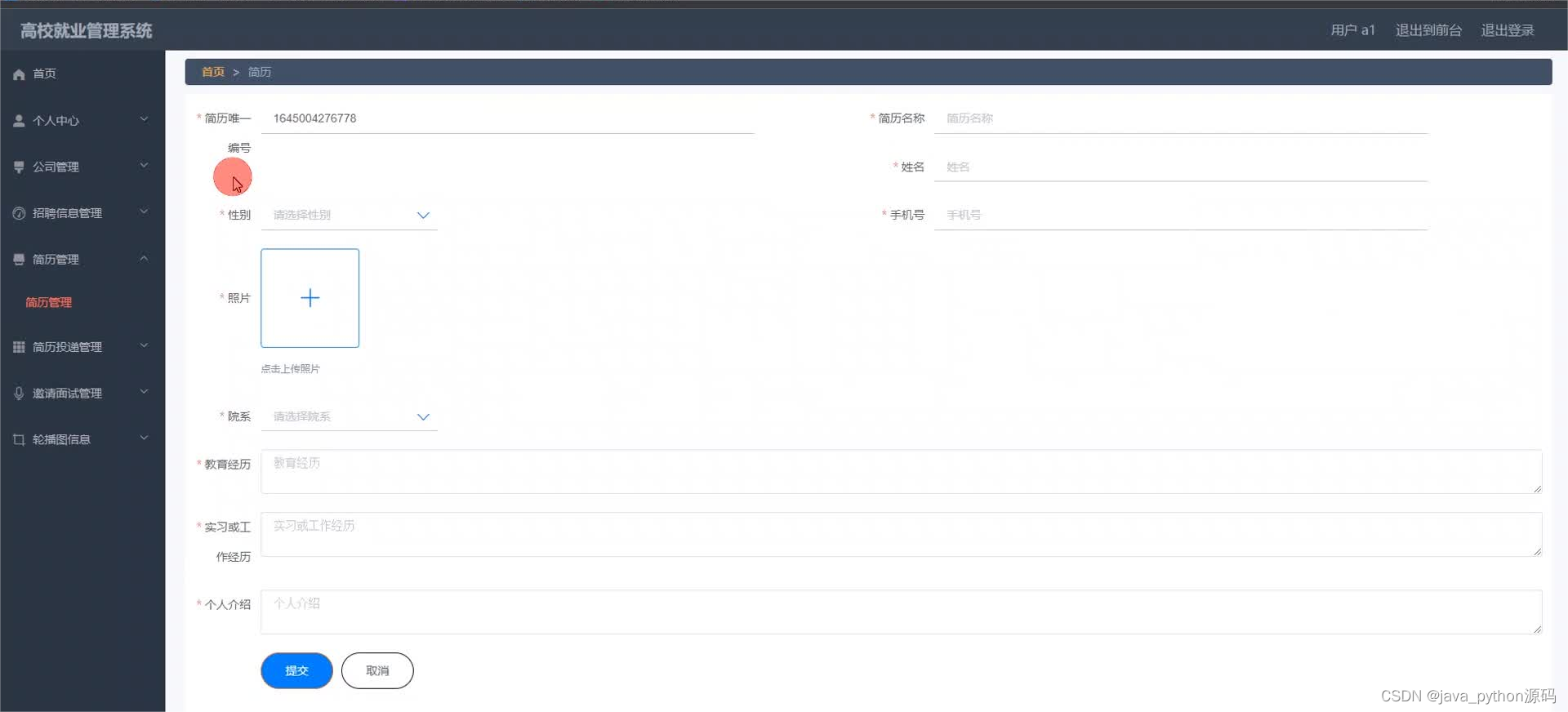 这是一个基于JavaSSM框架和VUE.js开发的高校就业管理系统,包含管理员、公司和用户三种角色的功能模块,如简历投递、面试邀请管理等。系统提供完整的源码、论文及相关开发工具,适合学习和实践。