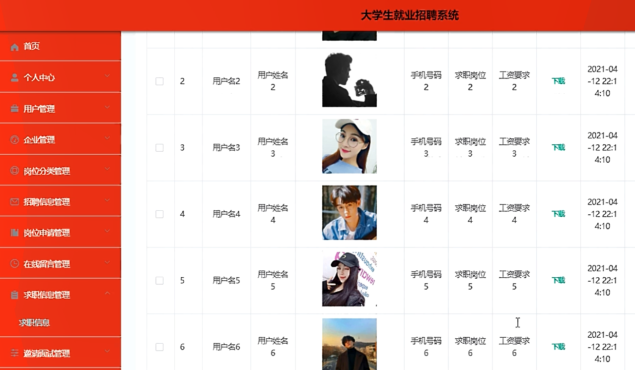 管理端功能有:学生用户管理、企业管理、岗位分类管理、招聘信息管理、岗位申请管理、在线留言管理、求职信息管理、面试要请管理、系统管理等
